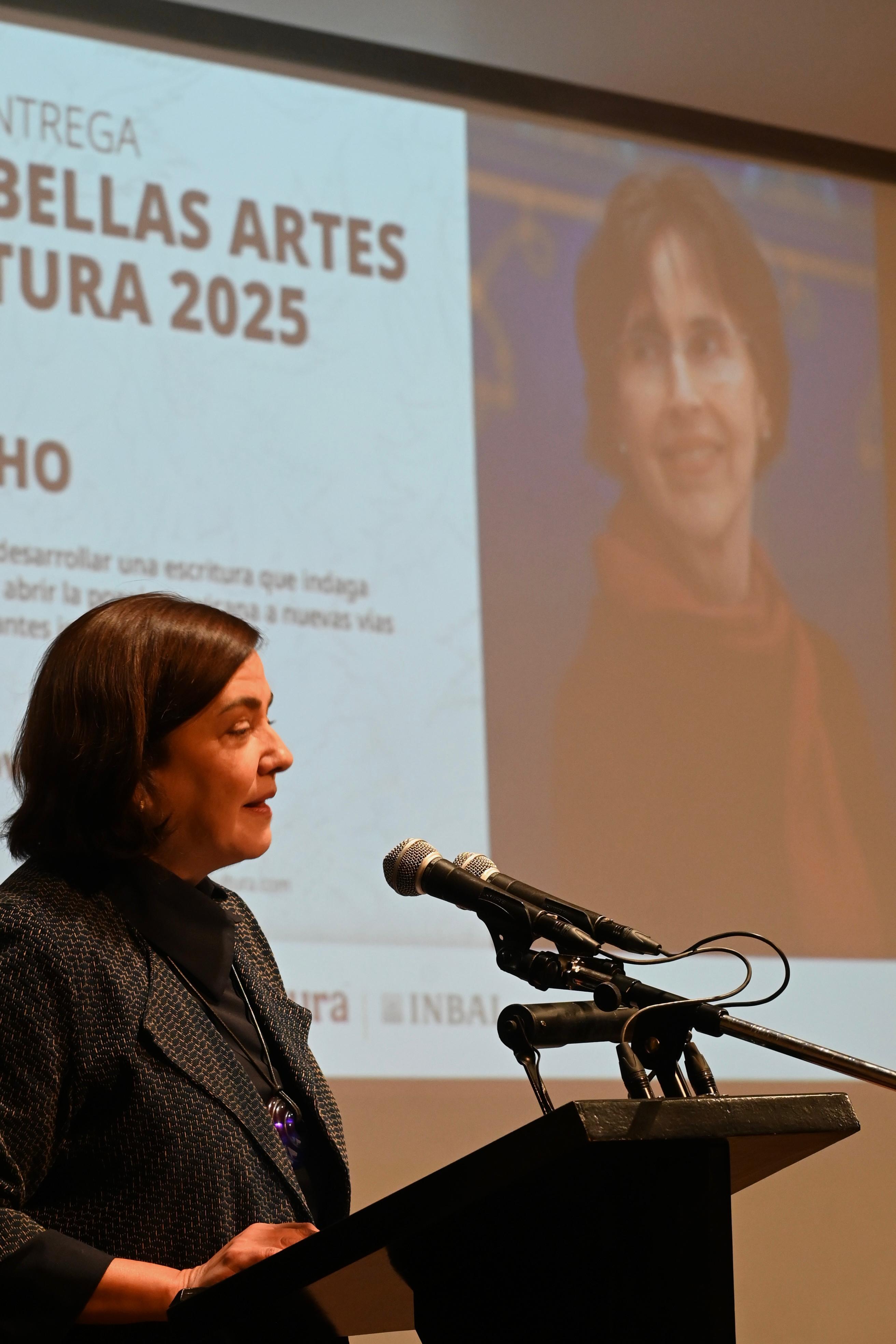 La poeta estuvo acompañada en el presídium por la directora general del INBAL, Alejandra de la Paz; la coordinadora nacional de Literatura, Nadia López García; el poeta y representante del jurado, Eduardo Casar y la escritora Miriam Moscona.