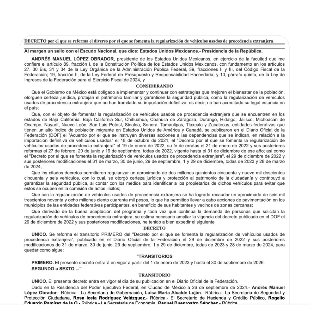 Seis meses después de esa entrevista, el 26 de septiembre de 2024, Andrés Manuel López Obrador emitió otra reforma al decreto para ampliar la legalización de los llamados autos “chocolates” hasta el 30 de septiembre de 2026.