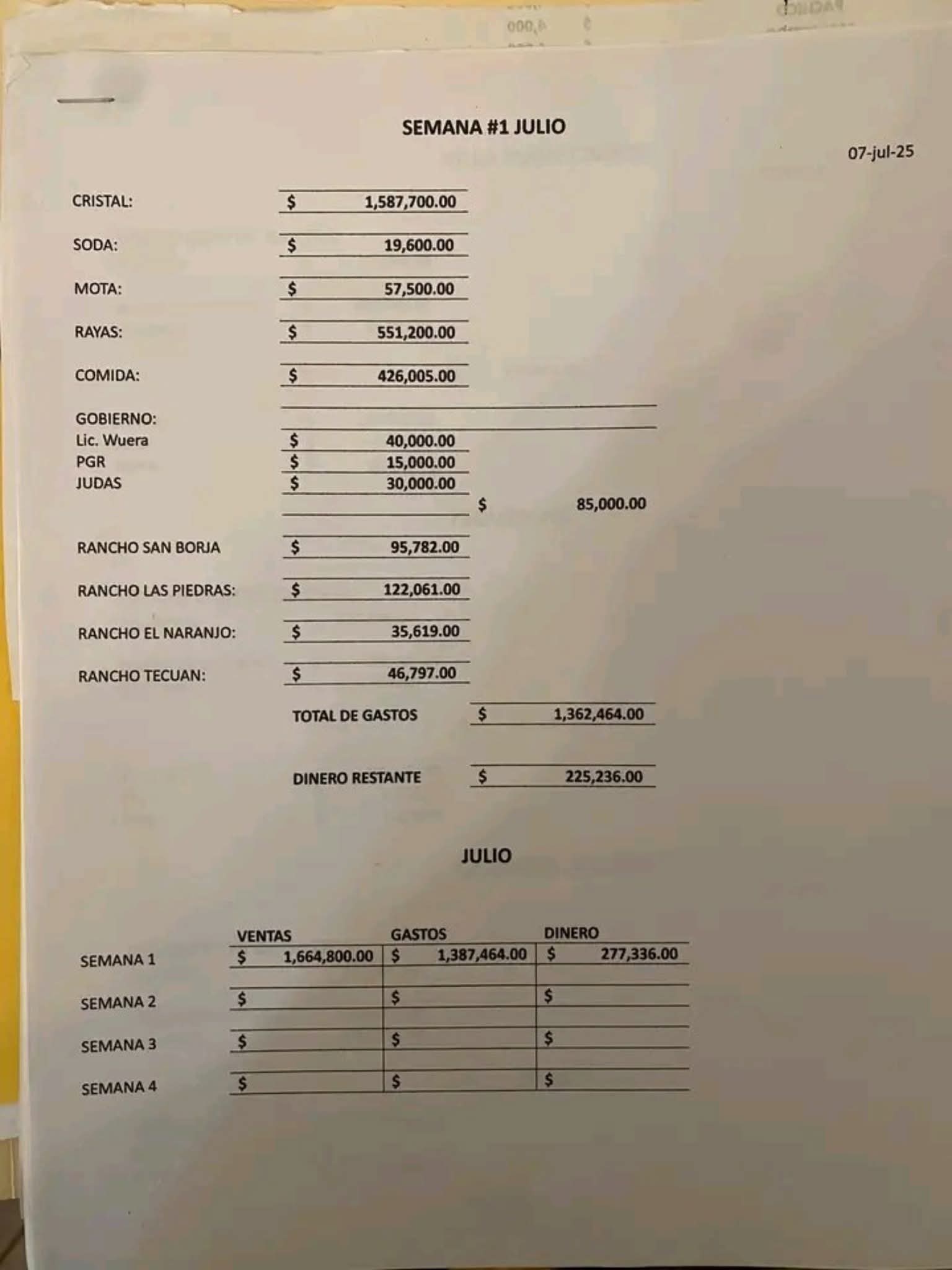 En otros documentos aparecen reportes de “Semana 1 Julio” con ventas por más de 1.6 millones de pesos en una sola semana y gastos superiores al millón 300 mil pesos, reflejando un esquema de control financiero similar al de una empresa formal: ventas, egresos, fondo restante y cortes semanales.