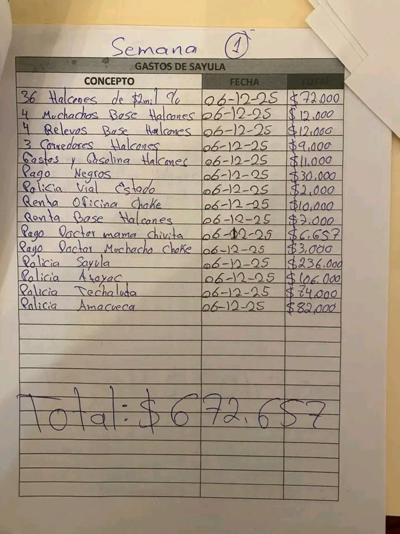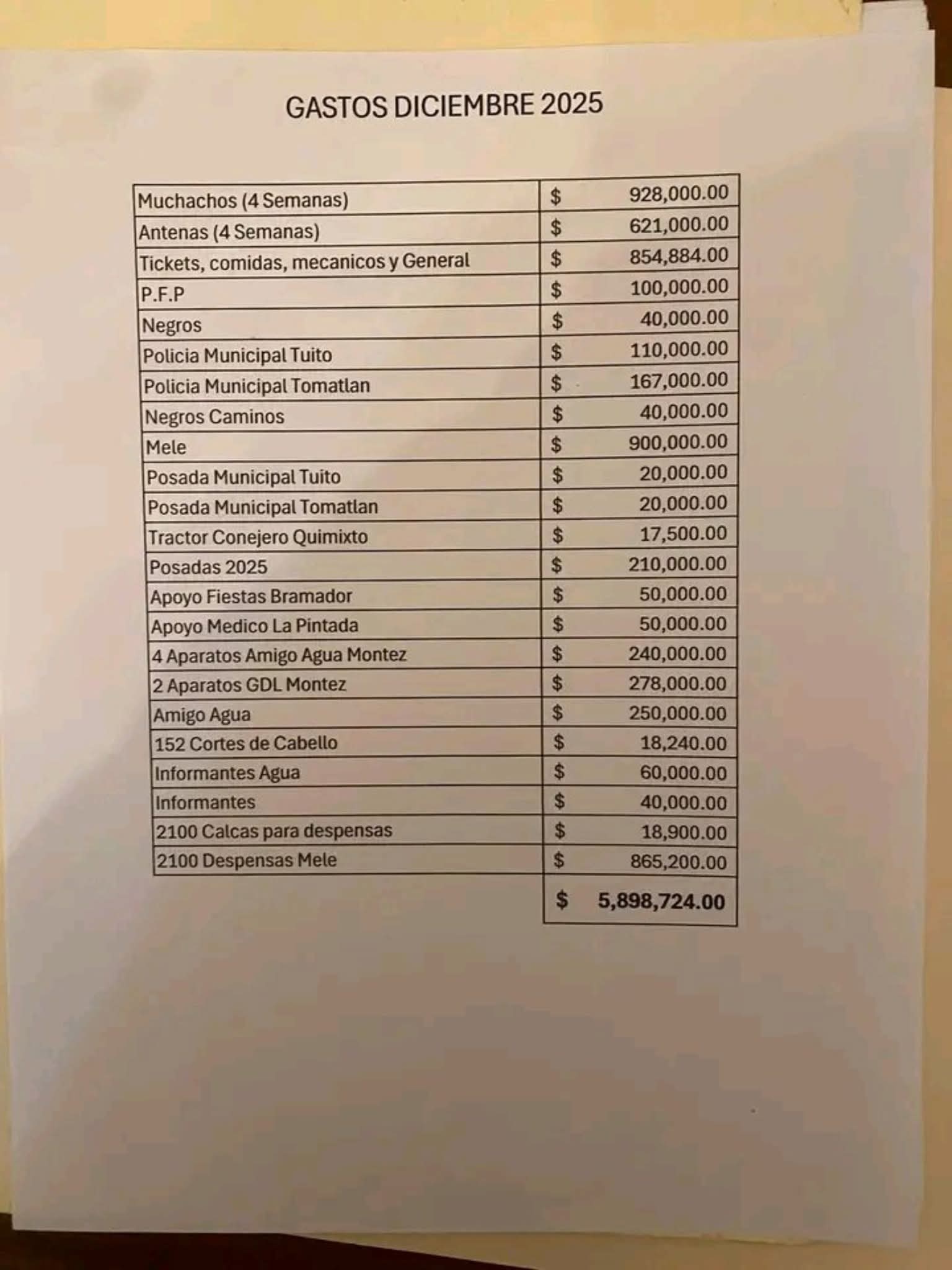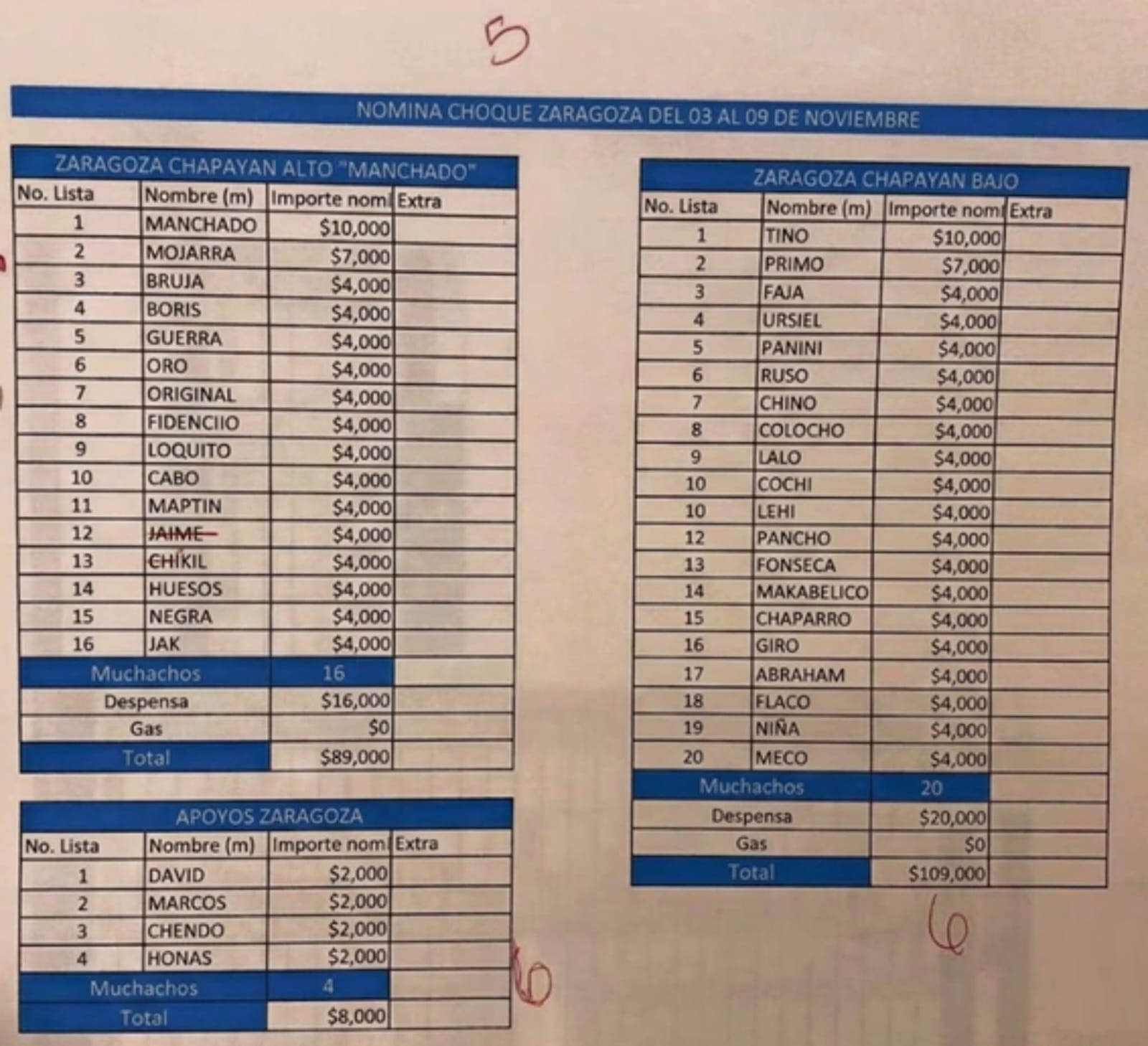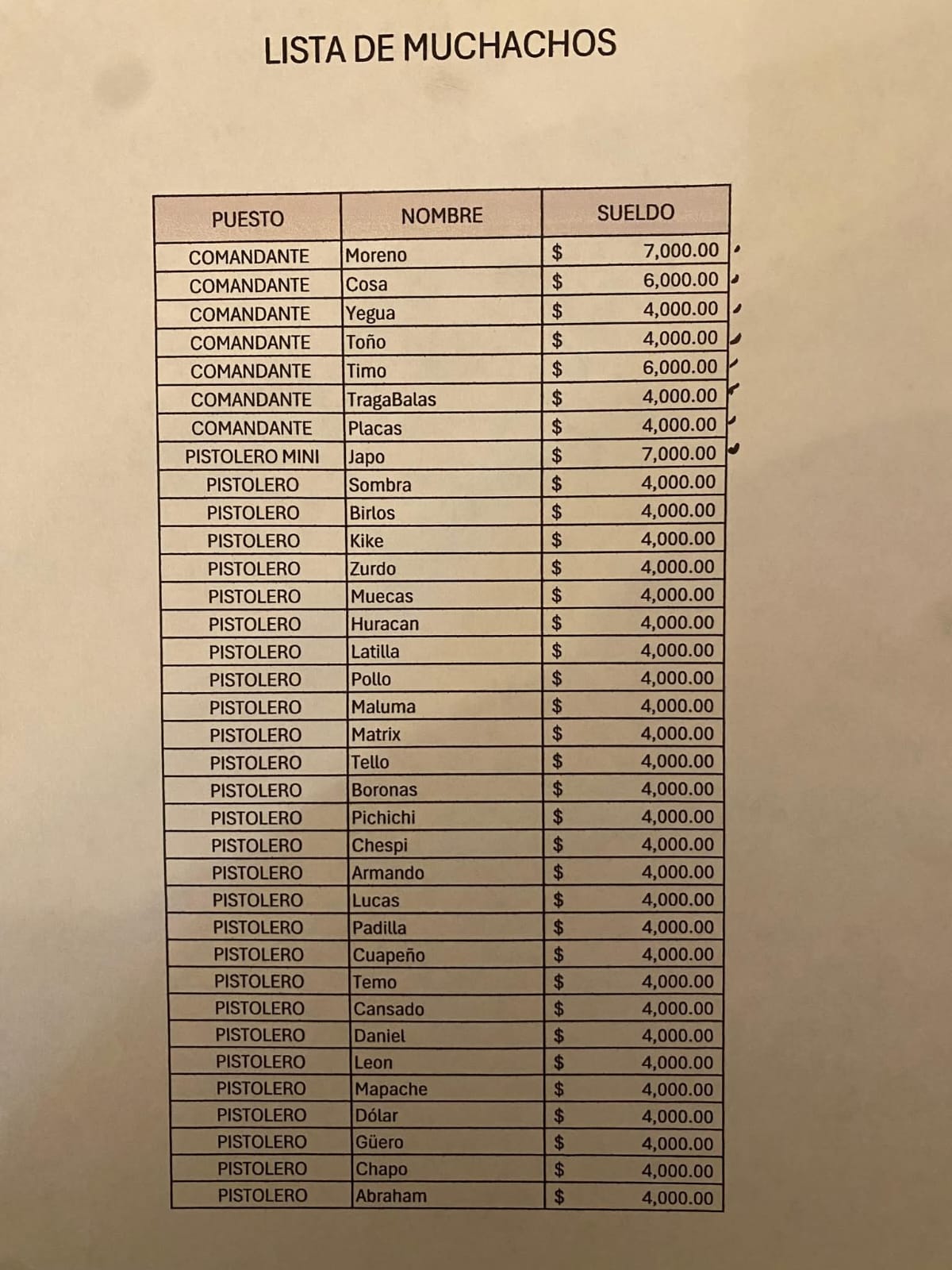 Entre los documentos figura una “Lista de Muchachos” con más de 30 nombres y sueldos que oscilan entre 4 mil y 7 mil pesos, incluyendo comandantes y pistoleros. Otra hoja consigna pagos semanales en municipios como Sayula y Tapalpa, con totales que superan los 600 mil pesos en algunos casos.