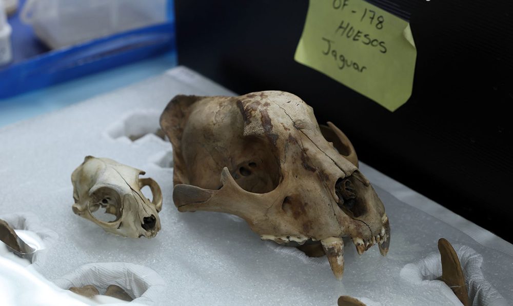 Báez describe: “El ejemplar de jaguar lo encontramos rodeado de una cantidad brutal de conchas, las más pequeñas fueron depositadas por debajo, a manera de cama, y en torno a él caracoles, que sabemos fueron colectados vivos porque preservaron el periostraco (la capa exterior de la concha). Todos los elementos marinos, debieron llegar en ollas con agua de mar para tratar de conservarlos, al igual que mantuvieron vivo al felino, hasta el momento de la magna ceremonia.
