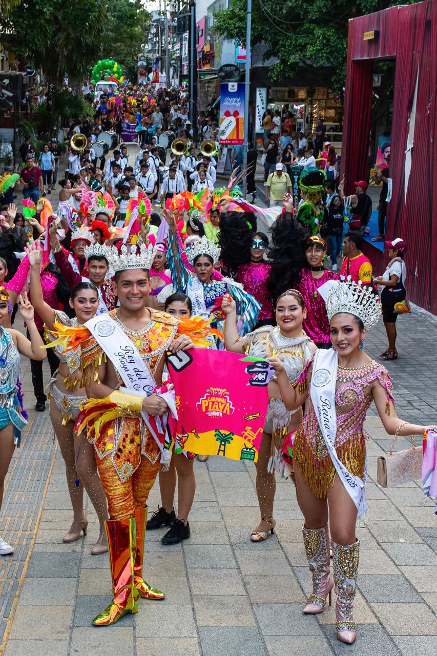 El paseo inició en la emblemática e internacionalmente conocida Quinta Avenida con Juárez, con la participación, en primer lugar, de los soberanos del carnaval Metzli Monterroza y Joel González, quienes bailaron y lucieron atuendos multicolores, arrancando aplausos de turistas.