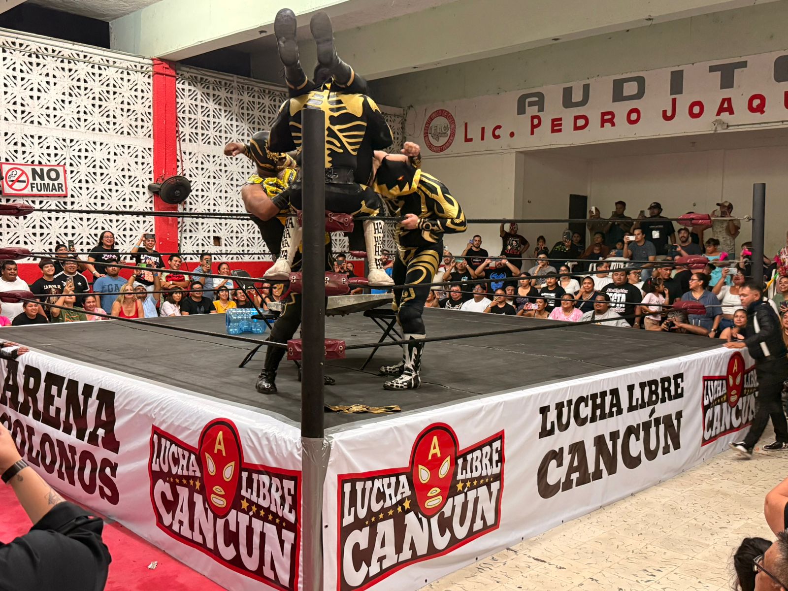 CANCÚN, Q. ROO a 3 de agosto.- Con grandes figuras del pancracio nacional, internacional y local, la promotora Lucha Libre Cancún (LLC), celebró la noche del pasado viernes su X Aniversario, presentando un cartel variado de cinco combates, destacando tanto en la batalla estelar como en la semifinal, la presencia de exponentes foráneos con trayectoria más que probada, sin dejar de lado la Gran Final de la primera -Copa Santiago Ortiz Quintal-, ante un lleno absoluto en la “Arena Colonos” de la SM 89.