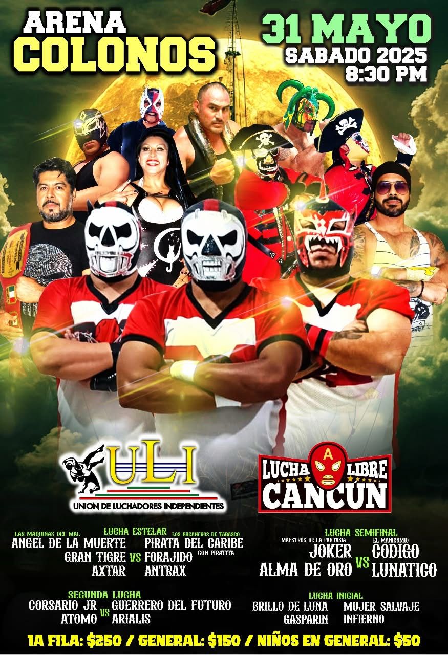 CANCÚN, Q. ROO a 27 de mayo.- Una vez más las promotoras Lucha Libre Cancún (LLC) y Unión de Luchadores Independientes (ULI), unirán esfuerzos para presentar un cartel muy atractivo, al tener como invitados especiales a exponentes del pancracio tabasqueño, pertenecientes a Promo Star, quienes protagonizarán la contienda estelar este próximo sábado 31 de mayo en punto de las 20:30 horas en la Arena “Colonos” de la SM 89, en una cartelera que presentará cuatro combates en total.