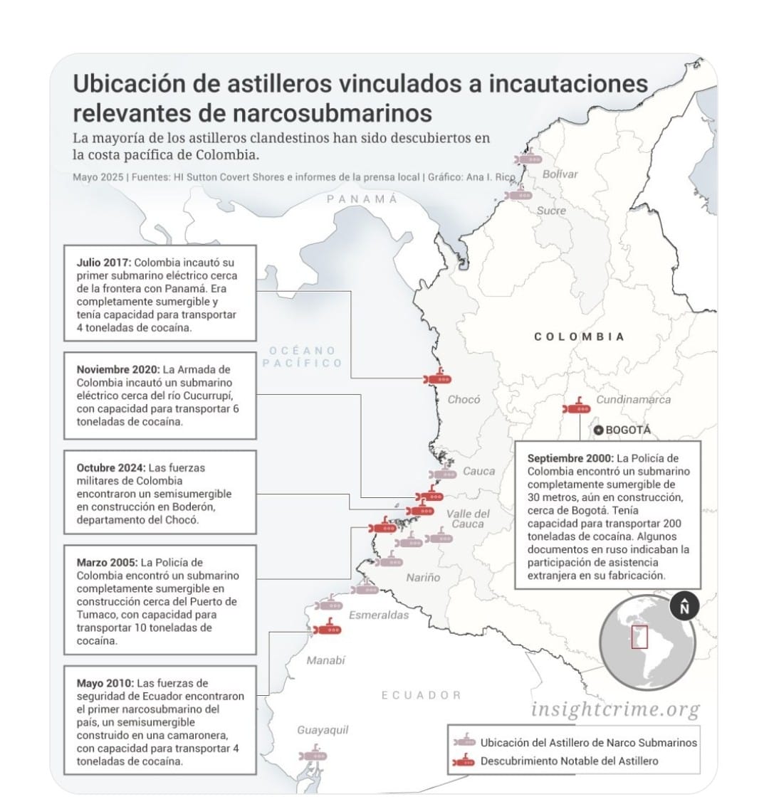 La Armada de Colombia detectó el 1 de abril un narcosubmarino teledirigido cerca del Parque Tayrona, con capacidad para transportar 1,5 toneladas de cocaína y tecnología satelital Starlink.