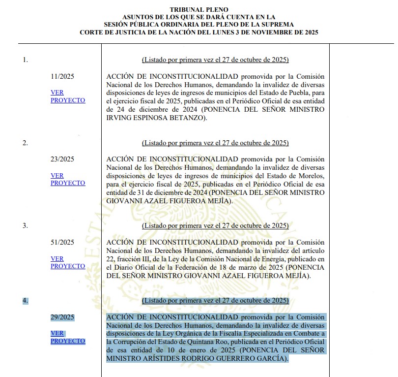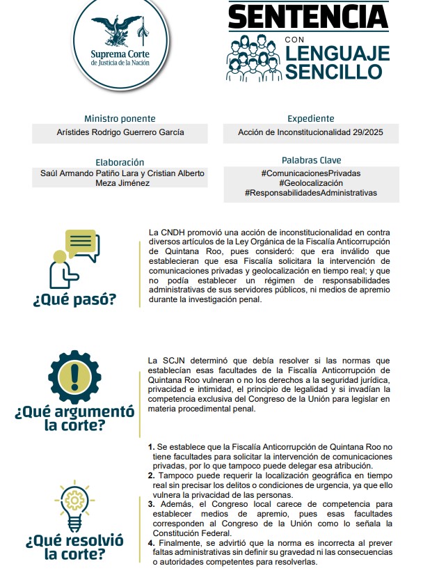 El proyecto es para resolver la acción de inconstitucionalidad 29/2025, promovida por la Comisión Nacional de los Derechos Humanos (CNDH) en contra de diversos artículos de la Ley Orgánica de la Fiscalía Anticorrupción de Quintana Roo, algunos de los cuales permitían al ahora órgano autónomo, encabezado por Edgar Ramírez Morales, solicitar la localización geográfica de personas en tiempo real, además de la intervención de comunicaciones privadas.