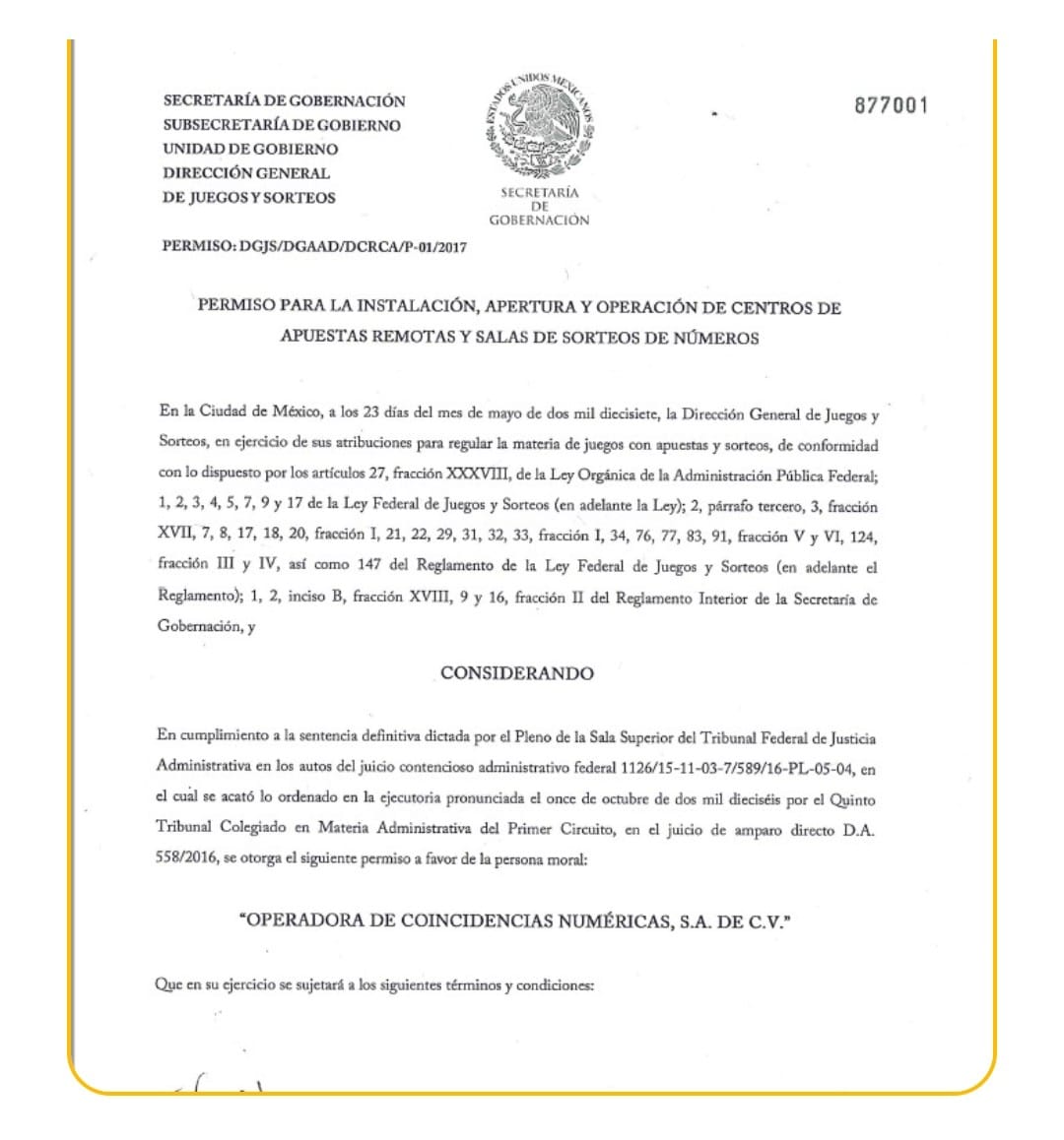 Debido a eso, en 2017, la Dirección General de Juegos y Sorteos otorgó a la empresa “Operadora de Coincidencias Numericas S.A. de C.V.” el permiso DJS/DGAAD/DCRCA/2017 para que pudiera operar casinos por 12 años, hasta el 23 de mayo de 2029.