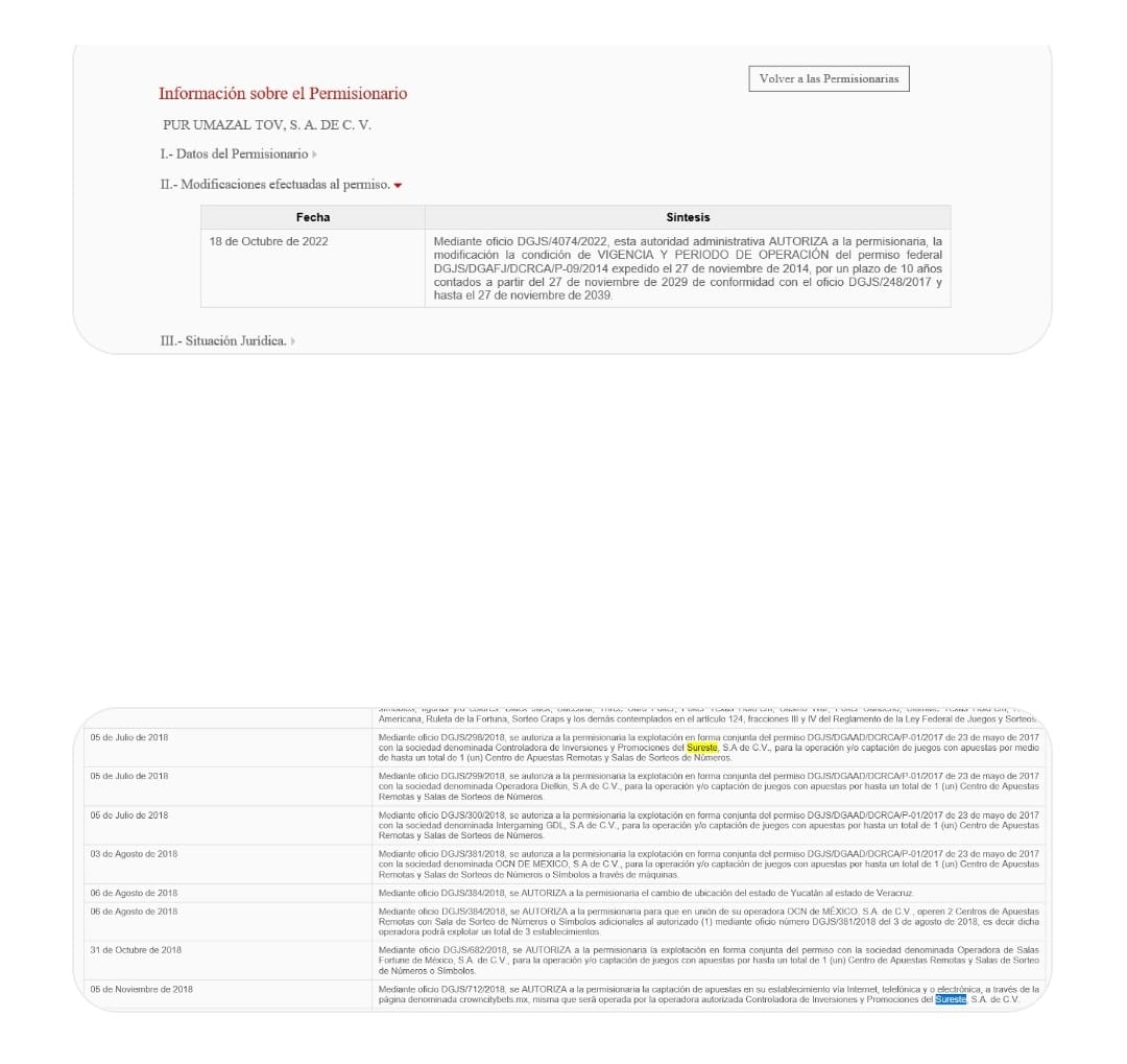 Mientras que la renovación de la concesión de PUR UMAZAL TOV se realizó el 18 de octubre de 2022, bajo el amparo de la Dirección General de Juegos y Sorteos, por 10 años adicionales a esta empresa que es socia de “Con Suerte y Alegría en Carmen S.A.P.I.”, “Con Suerte y Alegría Guaymas S.A.P.I.” y “Con Suerte y Alegría Navojoa”.