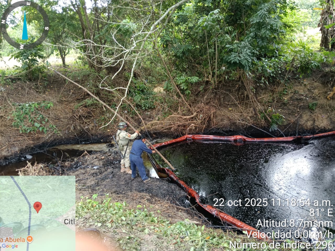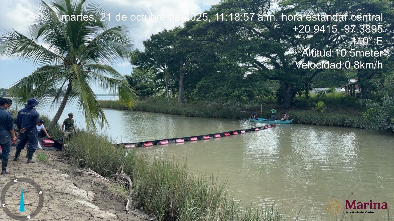 De igual manera, en coordinación interinstitucional se cuenta con un despliegue de 750 elementos pertenecientes a PEMEX, autoridades locales, empresas privadas y Marina, quienes han instalado 22 barreras con un aproximado de 1,970 metros en las bocas de los esteros de Zapotal Zaragoza, Quinta Las Puertas, Casa Blanca, Tenechaco, Palma Sola, Tumilco, La Calzada, Tampamachoco y Jácome; asimismo, se llevan recolectados 345,000 litros de hidrocarburos.