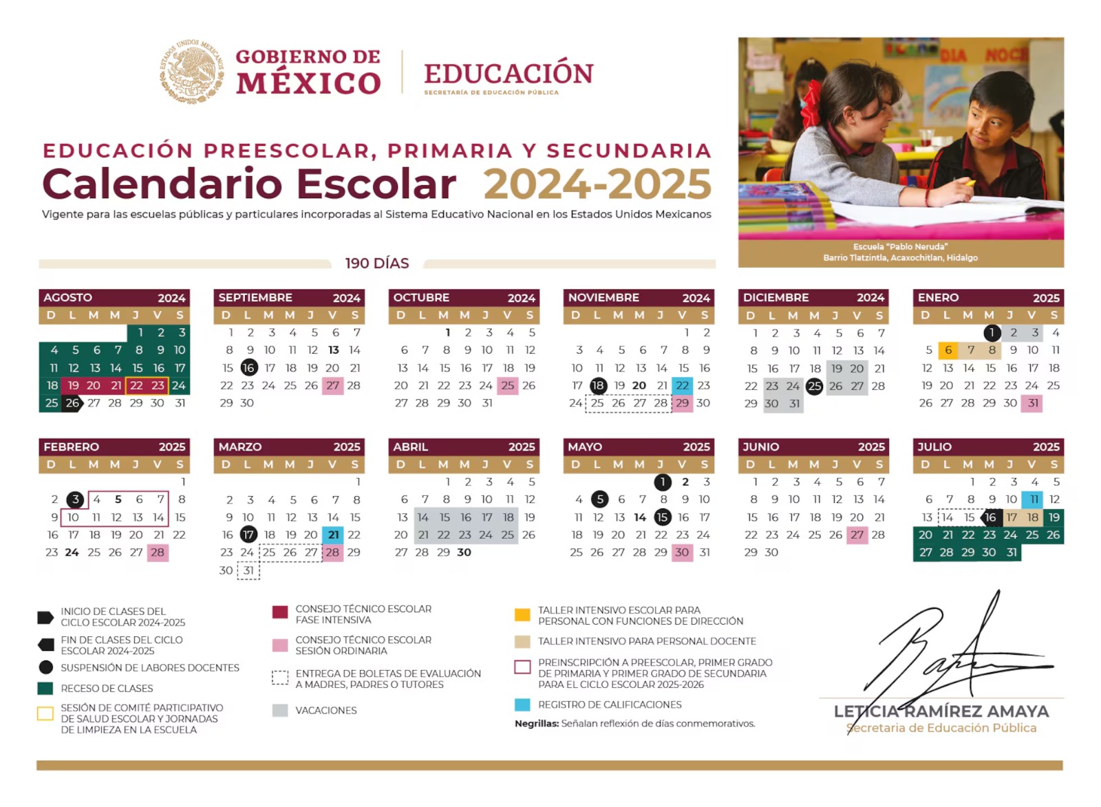 Le comparto el calendario de la SEP para el ciclo escolar 2024-2025. Son 190 días de clases más vacaciones, puentes y otras actividadespic.twitter.com/9inCJMlYmM