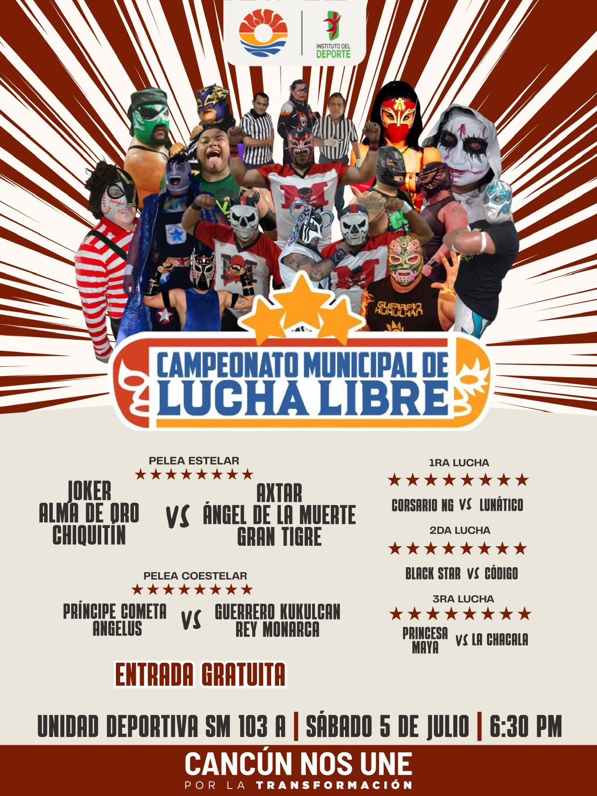 CANCÚN, Q. ROO a 30 de junio.- Desde marzo pasado se ha venido llevando a cabo el Campeonato Municipal de Lucha Libre, organizado en conjunto por el Instituto Municipal del Deporte de Benito Juárez (IMDBJ) y las ocho promotoras cancunenses del pancracio, mismo que este próximo sábado 5 de julio celebrará su cuarta eliminatoria, la cual tendrá lugar en punto de las 18:30 horas con acceso gratuito, en la unidad deportiva de la SM 103 A, ubicada entre la avenida Miguel Hidalgo (Ruta 5) y la avenida Puerto Juárez (Talleres), muy cerca de las avenidas Ixtepec y 149.