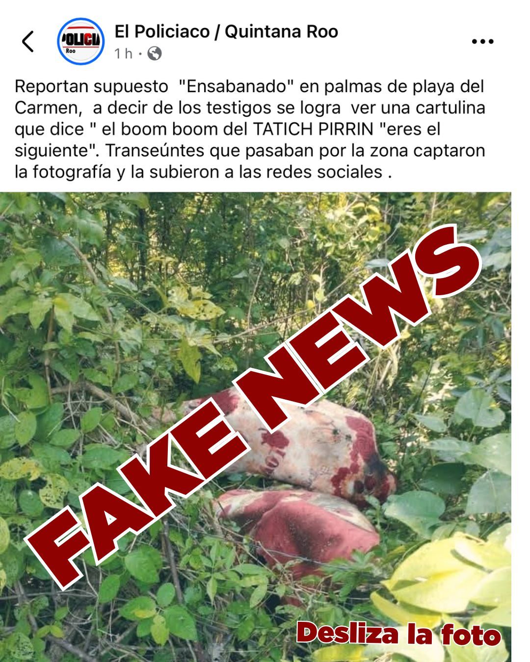 Playa del Carmen, a 3 de mayo de 2025.-La Secretaría de Seguridad Ciudadana de Playa del Carmen informa que es completamente falsa la información que circula en redes sociales sobre el hallazgo de una persona ensabanada con un mensaje en el fraccionamiento Palmas I.