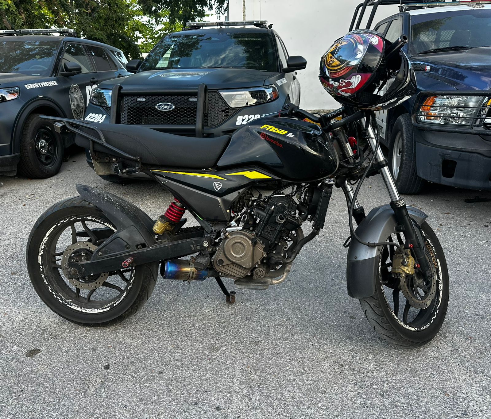 En un segundo hecho, durante recorridos de vigilancia en la colonia Centro fue asegurada una motocicleta de la marca Italika color negro con calcomanías amarillas, la cual presentaba irregularidades en el número de motor que correspondía a otra unidad con reporte de robo, por lo que fue asegurada.