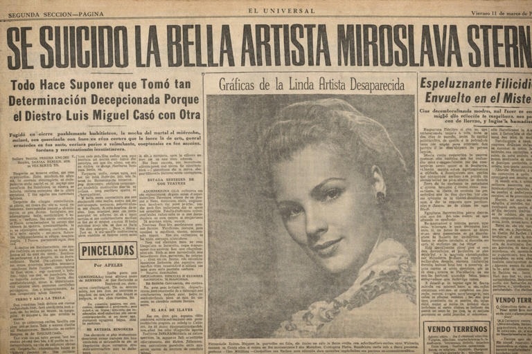 “Se suicida la bella artista Miroslava Stern”; la nota detalló que la actriz ingirió un barbitúrico, que su ama de llaves la encontró muerta en su habitación y que se encontraba triste por una decepción amorosa.
