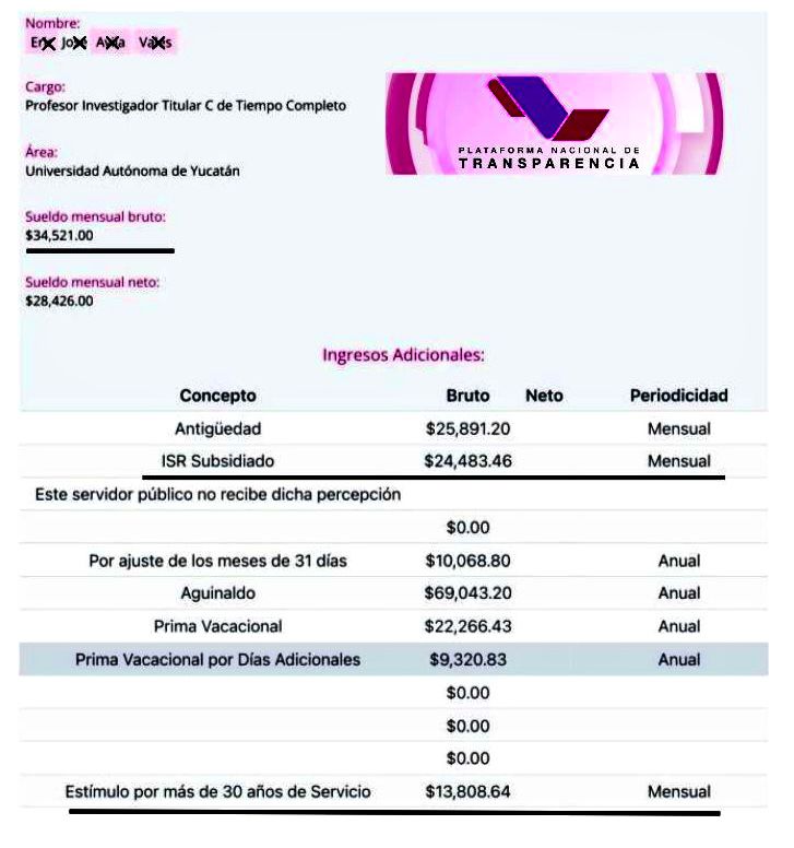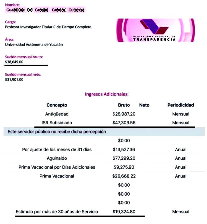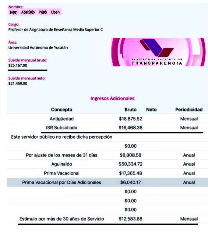 De acuerdo con una consulta realizada en la Plataforma Nacional de Transparencia, las prestaciones y subsidios otorgados al personal más antiguo son realmente onerosas. Por ejemplo, un profesor titular C (la categoría más alta) que tenga más de 40 años de servicio, puede cobrar más de 100 mil pesos al mes cuando se suman los conceptos de su salario mensual ($38,649.00), antigüedad ($28,987), estímulo por más de 30 años de servicio ($19,324) e ISR subsidiado ($47,307), entre otras prestaciones. Es decir, de su sueldo total debería pagar casi 50 mil pesos de impuesto, pero esto lo paga la UADY de sus arcas y el docente cobra completo.