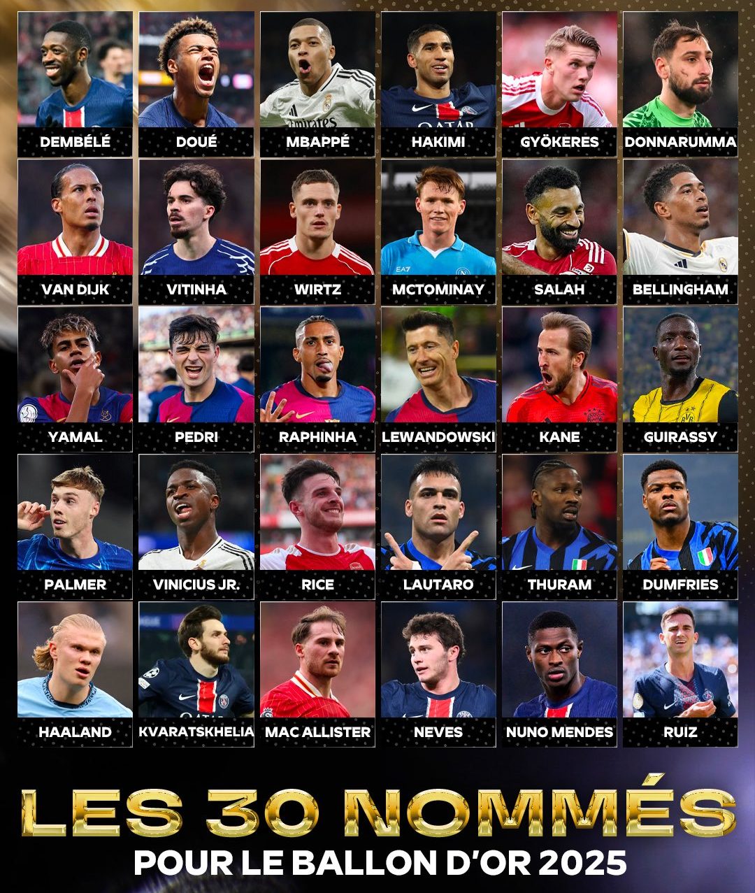 La lista de 30 candidatos incluye a nueve jugadores del PSG, cinco del Barcelona y tres del Real Madrid, pero la lucha parece estar entre Yamal y Dembelé
