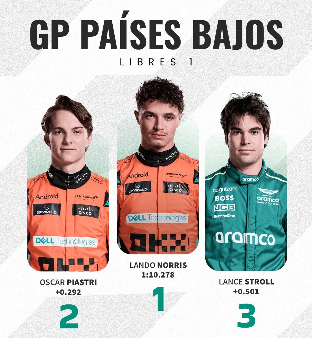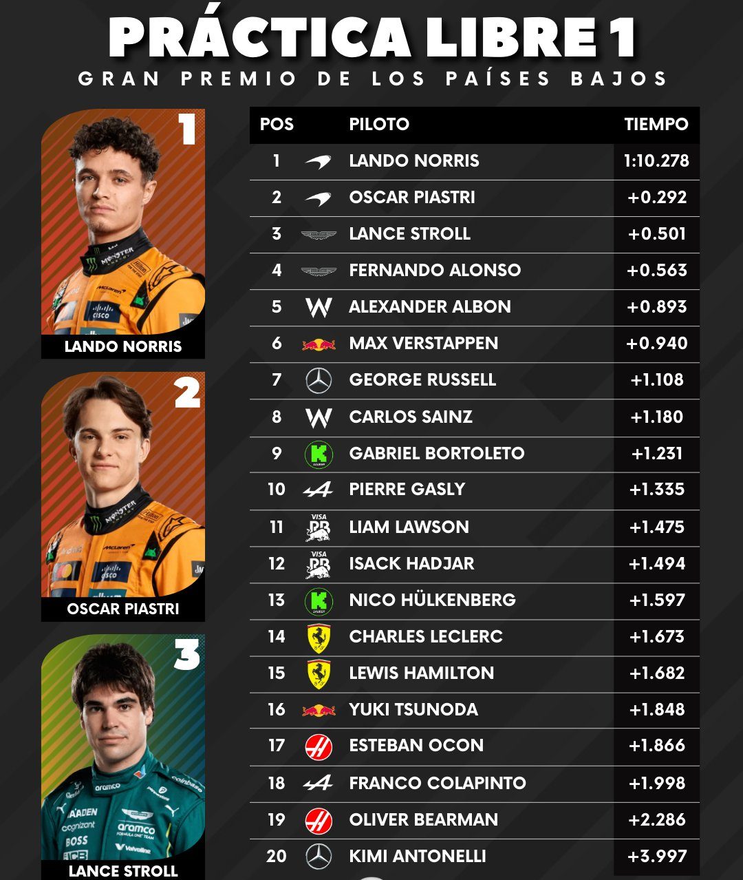 En la mejor de sus 35 vueltas, Norris cubrió, con el neumático de compuesto blando -con el que todos marcaron su mejor crono de la sesión-, los 4 mil 259 metros de la pista holandesa en un minuto, diez segundos y 278 milésimas, 292 menos que Piastri -que lo supera en nueve puntos en la general- y con 501 sobre el canadiense Lance Stroll (Aston Martin), que se inscribió tercero en la tabla de tiempos.