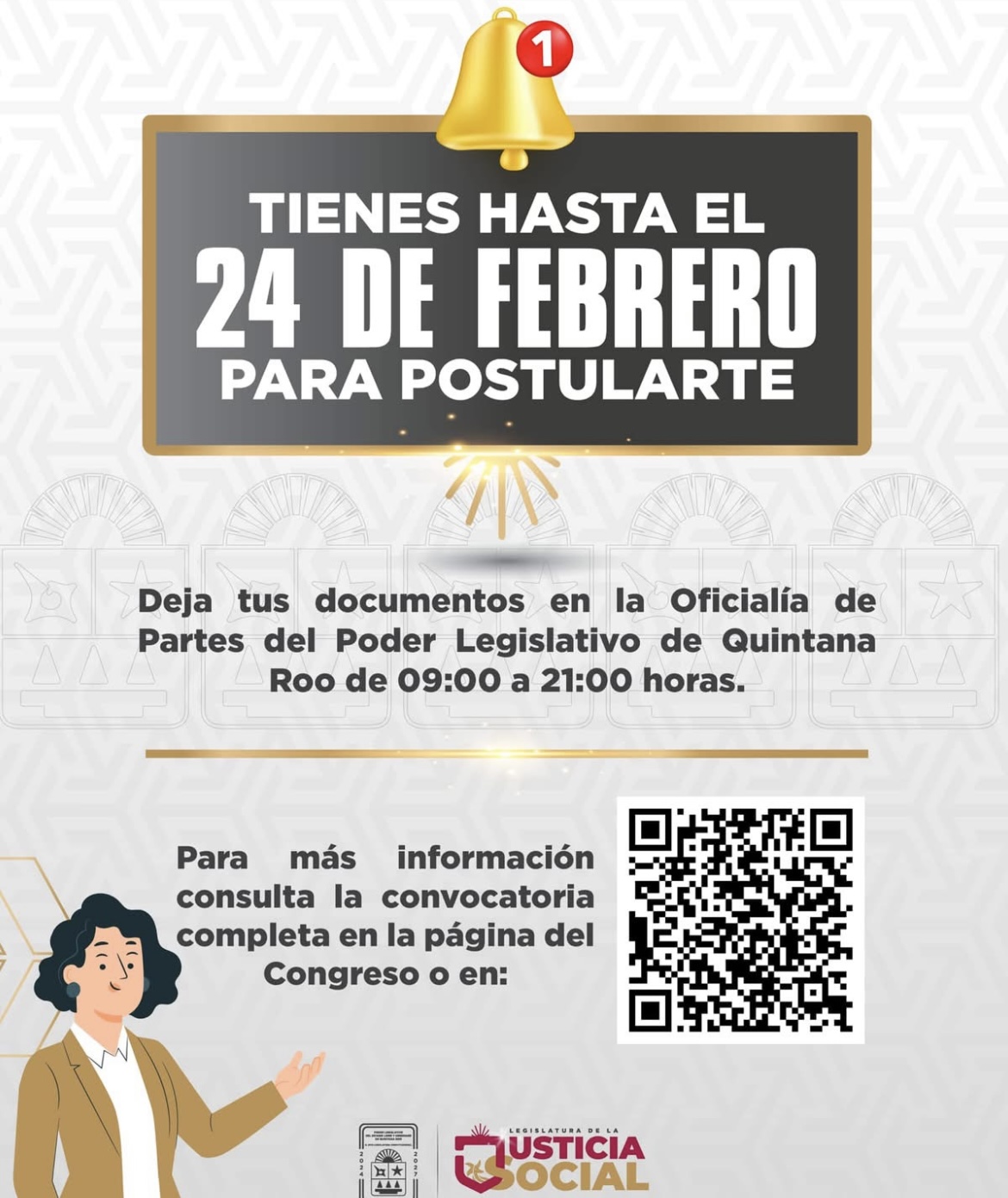 Para posteriormente, el día 12 de marzo, las comisiones de cada poder, hagan públicas las listas de 3 aspirantes que consideran idóneos, para remitirlos al Congreso del Estado a más tardar el 14 de marzo, para que éste integre las listas definitivas de las y los candidatos y se las haga llegar al Instituto Electoral de Quintana Roo el 20 de marzo, que es el día fijado como fecha límite.Como se recordará, la XVIII Legislatura aprobó el pasado 28 de febrero, la convocatoria para las personas profesionistas del derecho, con 5 años de ejercicio y uno de residencia en el estado, que deseen participar como candidatos en la elección extraordinaria de Magistrados, Magistradas, Juezas y Jueces del Poder Judicial Local, que se realizará el domingo 1 de junio de manera concurrente con la elección de personas juzgadoras federales.