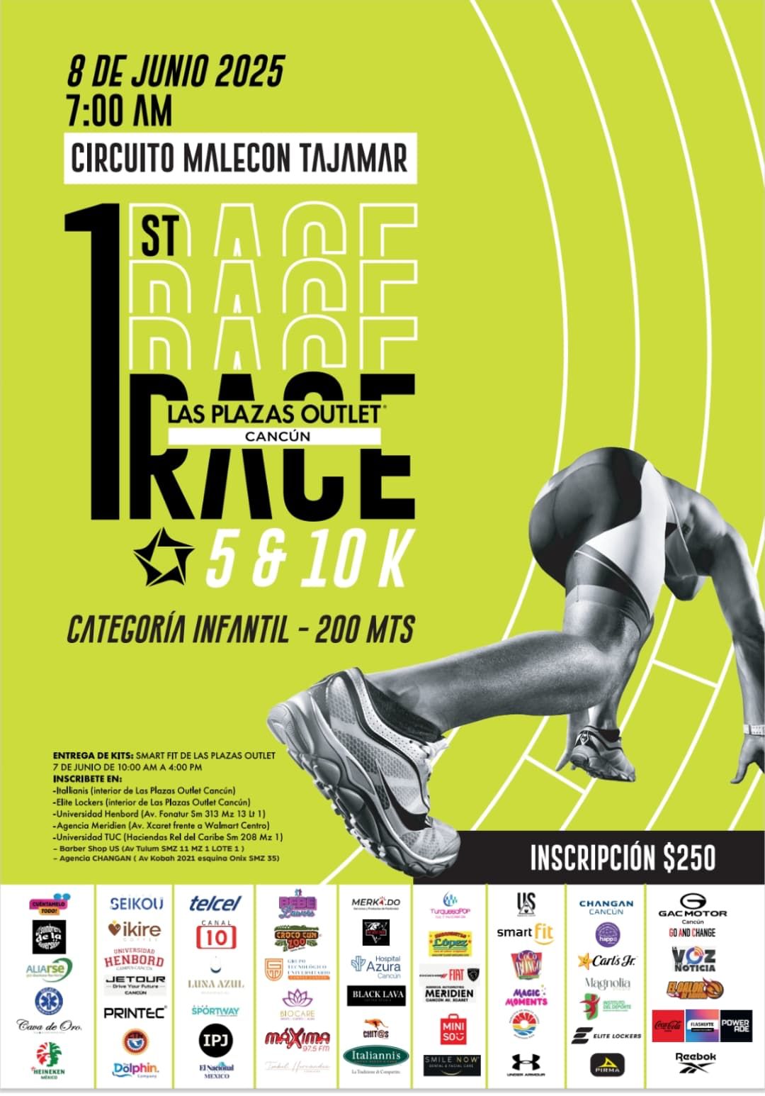 De igual manera se dio a conocer que las inscripciones ya se encuentran abiertas en algunos locales de la propia plaza ubicada en la avenida Andrés Quintana Roo, así como en otros cinco puntos a lo largo de la ciudad, incluyendo las Universidades Henbord y TUC; con un costo de 250 pesos por participante, en tanto que los -kits- serán entregados el sábado 7 de junio, a partir de las diez de la mañana y hasta las cuatro de la tarde, en el Smart Fit de Plazas Outlet Cancún.