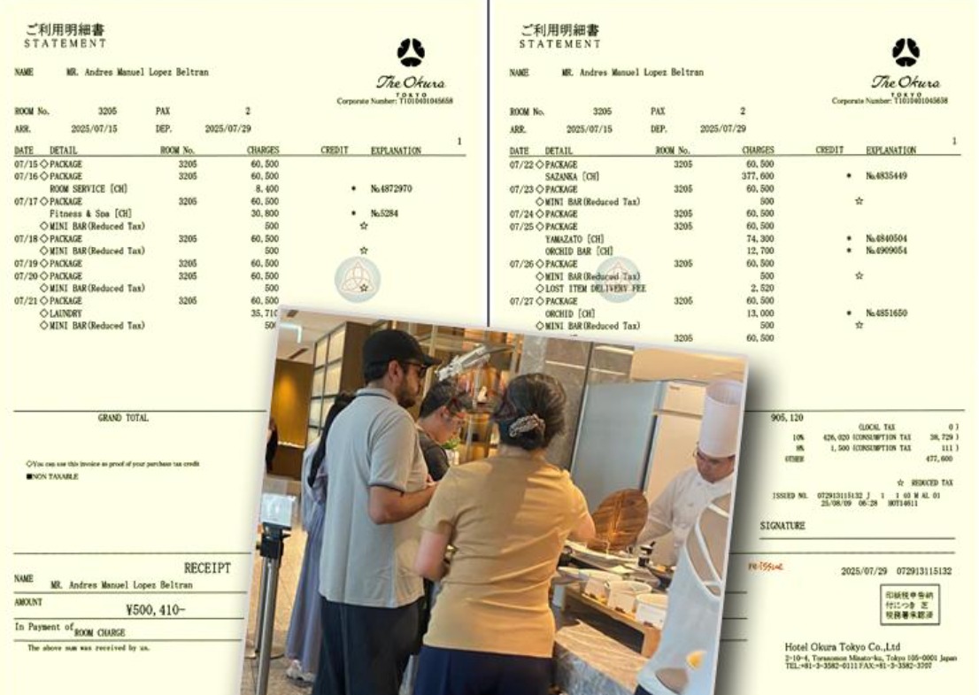 Con las facturas del hotel The Okura Tokyo se acredita que “Andy” López Beltrán erogó un millón 405 mil 530 yenes, durante su estancia de 14 días, en Tokio, Japón, cifra equivalente a 177 mil 67 pesos mexicanos, al tipo de cambio actual.