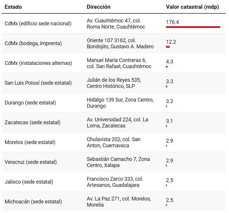 Si hacemos caso a lo que reporta en el Sistema de Portales de Obligaciones de Transparencia (Sipot), en 35 años de historia ha acumulado 25 propiedades con un valor de 229.5 millones de pesos. La más costosa de todas es su sede nacional ubicada en Av. Cuauhtémoc 47, en la gentrificada colonia Roma. Se trata de un edificio, incluida la planta baja, de seis niveles en colores rojo y crema valuado en 176.4 mdp.