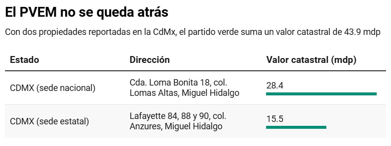 Como se señaló y de acuerdo con los registros del Sipot, el instituto fundado por Jorge González Torres sólo reporta un patrimonio de dos inmuebles, ambos en la Ciudad de México. El primero, su sede nacional, se localiza en Cerrada Loma Bonita 18, colonia Lomas Altas, alcaldía Miguel Hidalgo, y está valuado en 28.4 millones de pesos. En tanto que el segundo, que es el centro de operaciones de su comité directivo en la capital, consta de tres predios (Lafayette 84, 88 y 90, en la colonia Anzures) que juntos valen 15.5 millones.
