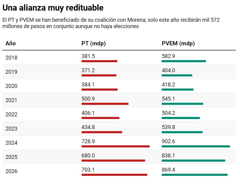 En el debate por la nueva reforma electoral promovida por la presidenta Claudia Sheinbaum, los dos aliados de Morena se resisten a perder la suculenta fuente de ingresos que les ha permitido, entre otras cosas, construir un patrimonio millonario.
