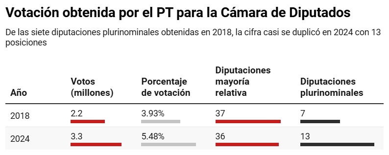 En 2012, los petistas ganaron apenas 11 curules en San Lázaro y seis en el Senado. Su alianza con el lopezobradorismo los catapultó a 44 diputados federales en 2018 y a 49 en 2014. En la Cámara Alta se mantuvo todos estos años con seis legisladores.