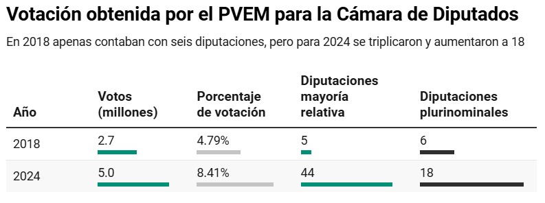 El PVEM sufrió un descalabro de 2012 a 2018 al ir todavía en alianza con el PRI durante esas elecciones: su fuerza legislativa cayó de 27 a 11 diputados y de nueve a siete senadores. No tardó mucho en entender los nuevos tiempos políticos y subirse al barco morenista, lo que le redituó en ganar 62 diputaciones y 14 senadurías en las últimas elecciones federales de 2024.