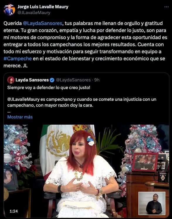 San Francisco de Campeche, Cam., 19 de diciembre.- “Querida #LaydaSansores, tus palabras me llenan de y gratitud eterna. Tu gran corazón y empatía por defender lo justo, son para mí motores de compromiso y la forma de agradecer esta oportunidad es entregar a todos los campechanos los mejores resultados”, dijo a través de una publicación el secretario de Desarrollo Económico, Jorge Luis Lavalle Maury.