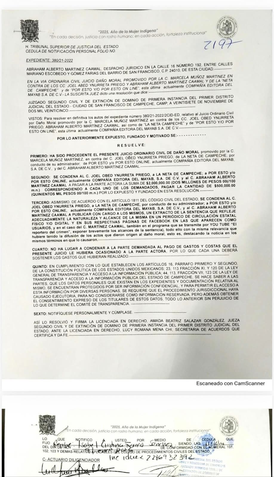 San Francisco de Campeche, Cam., 9 de enero.- En una muestra de que el Gobierno de Layda Sansores Sanromán seguirá utilizando a las instituciones procuradoras y administradoras de justicia como instrumentos de represión, la jueza segunda del ramo civil y de extinción de dominio de la primera instancia del Primer Distrito Judicial del Estado, Amada Beatriz Salazar González, resolvió que los periodistas Joel Obet Ynurreta Priego, Abraham Alberto Martínez Caamal y los medios La Neta de Campeche, por conducto de su administrador, y Por Esto y/o Por Esto online, actualmente Compañía Editorial del Mayab, son responsables de daño moral contra la jefa policiaca Marcela Muñoz Martínez.