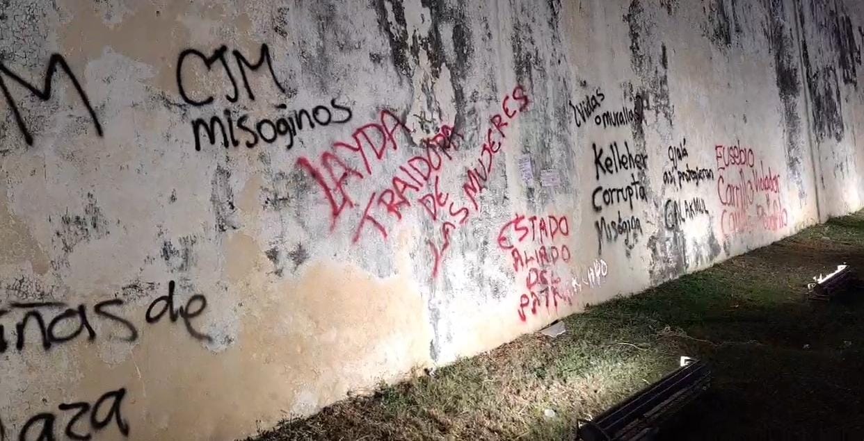 Cabe hacer mención que, al igual que ha ocurrido en años anteriores, las manifestantes grafitearon edificios y monumentos históricos, entre ellos una sección de la muralla de la calle 18.