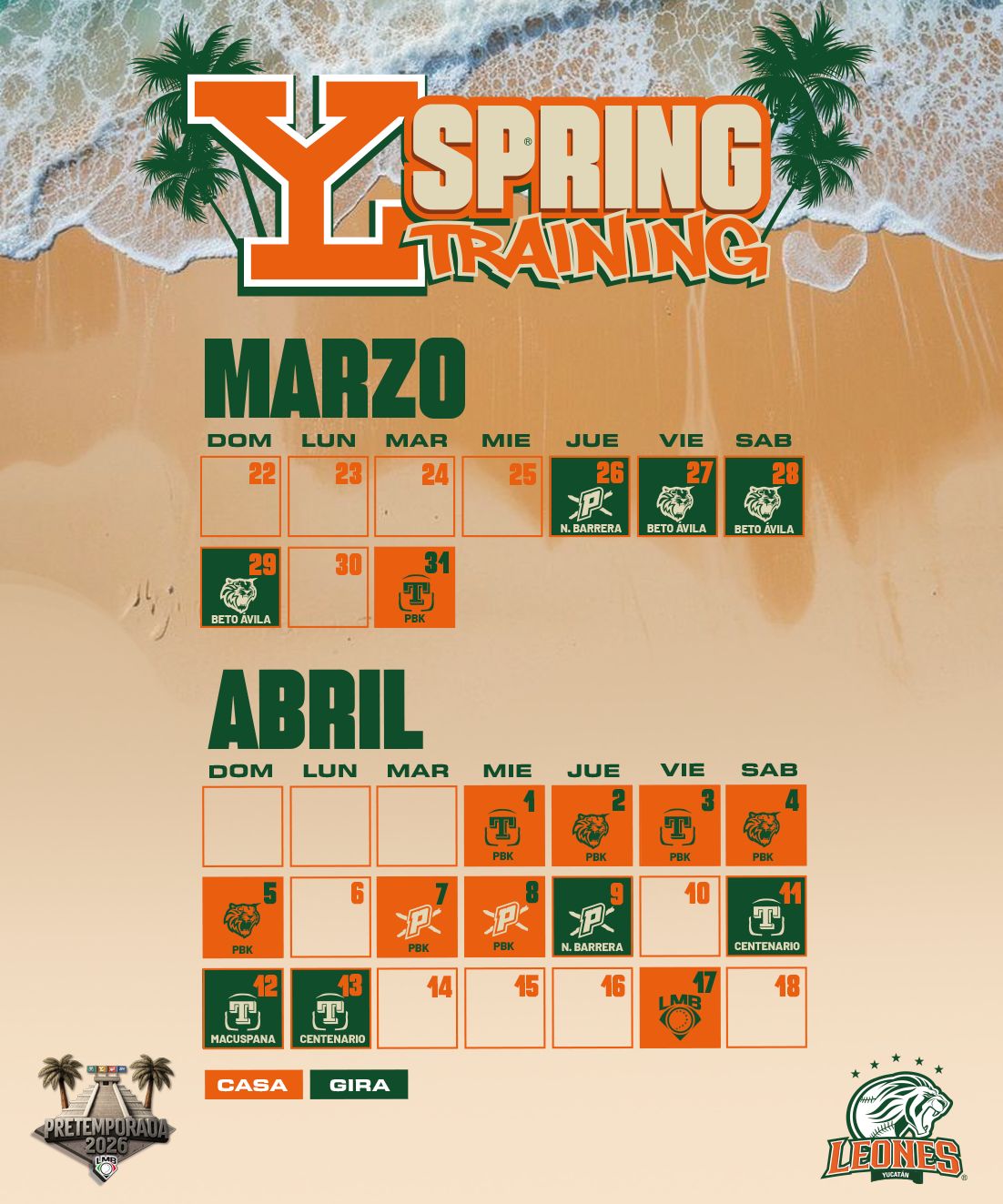 Los juegos de pretemporada darán inicio el 26 de marzo y contemplan un total de 16 encuentros, de los cuales 8 se disputarán en el Parque de Beisbol Kukulcán, permitiendo a la afición local vivir de cerca el proceso de preparación del equipo rumbo a una nueva temporada llena de expectativas.