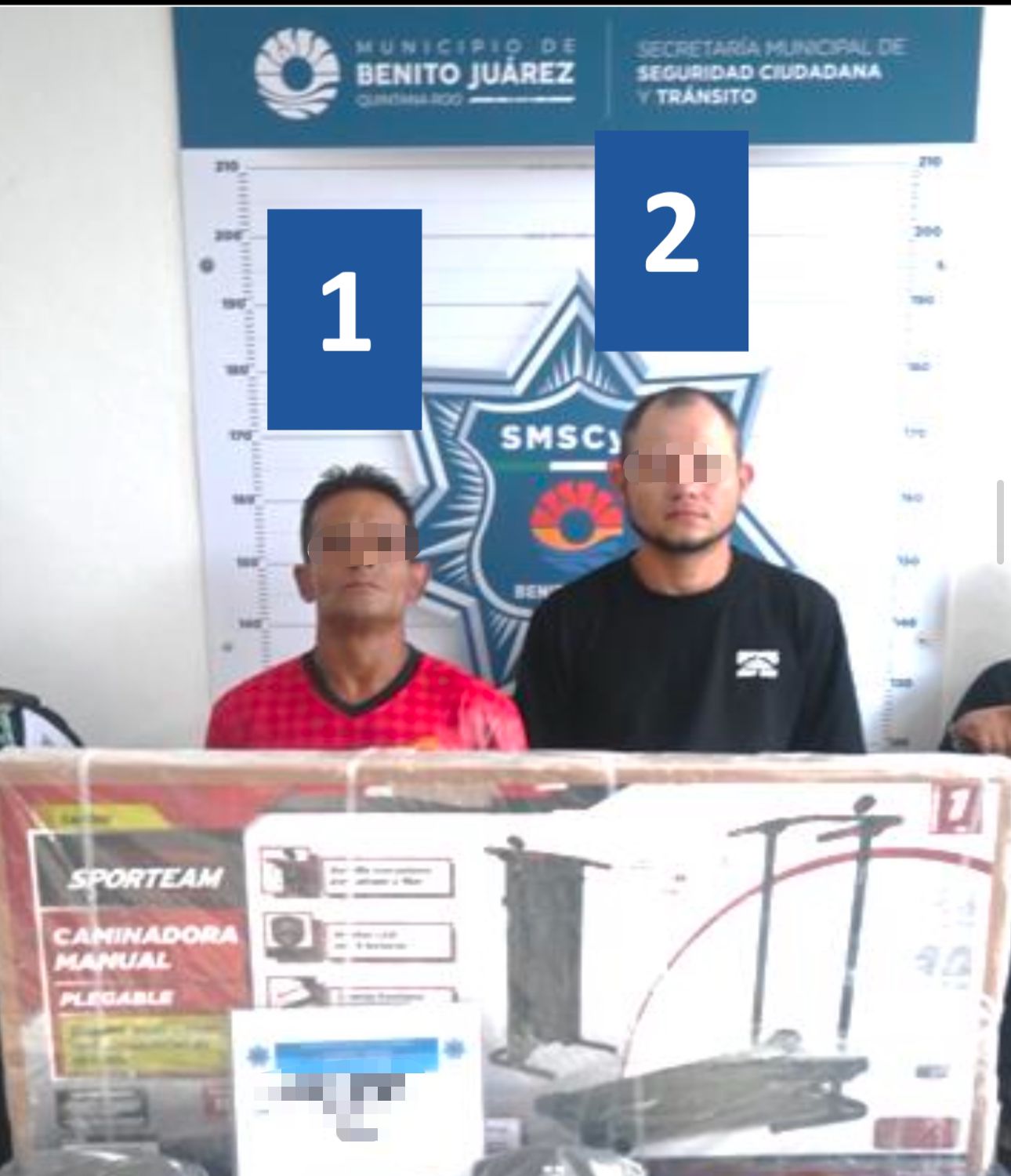 Cancún, 9 de febrero.- Elementos de la Secretaría Municipal de Seguridad Ciudadana y Tránsito de Benito Juárez detuvieron a Elliot “N”, de 42 años, y Eder Daniel “N”, de 29, tras ser sorprendidos robando en un supermercado de la Supermanzana 7 de Cancún.