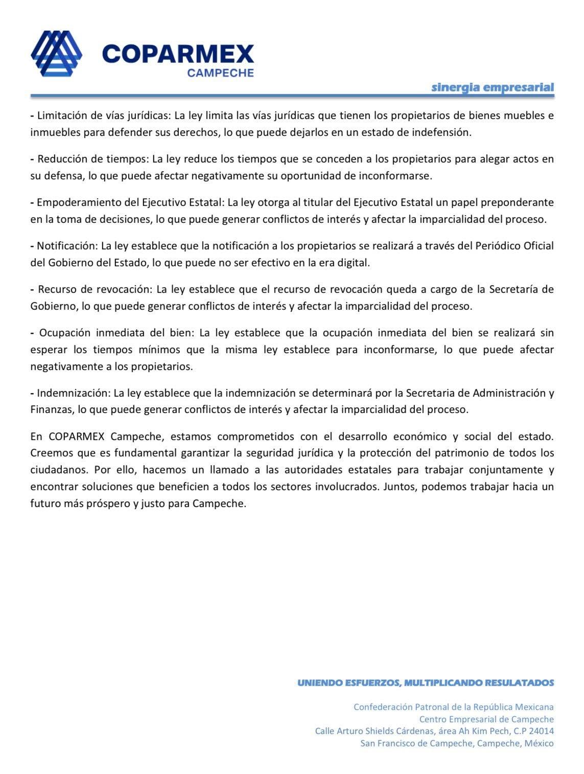 Tras un análisis exhaustivo de la nueva Ley de Expropiación y Limitaciones al Derecho de Propiedad, la Coparmex Campeche encontró “varias preocupaciones”, publicó su posicionamiento en su página y pidió revisar dicha Ley, mediante un diálogo abierto y constructivo, para garantizar la seguridad jurídica y la protección del patrimonio de los ciudadanos y empresarios. Su aplicación podría generar una “posible desigualdad jurídica”.