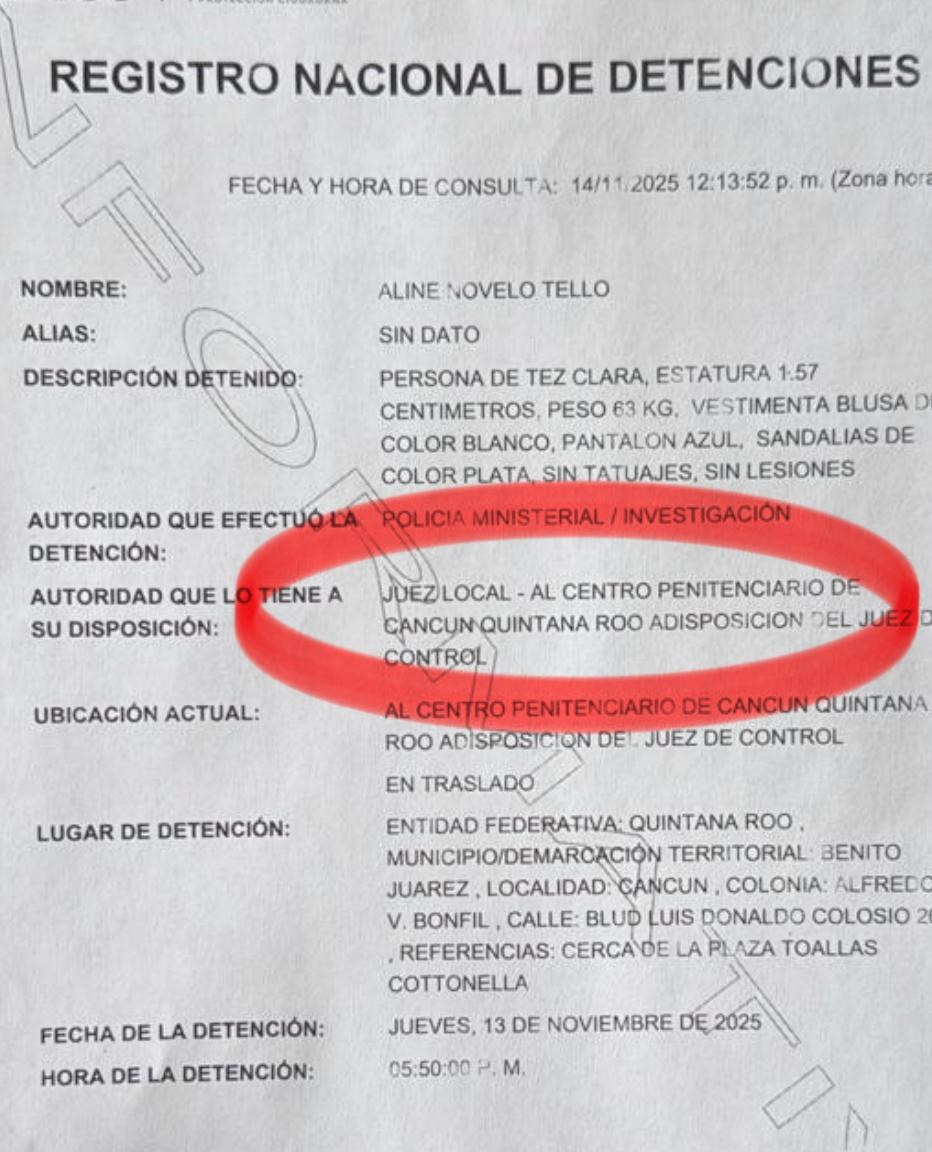 La asesora inmobiliaria Aline N.T. quien consta con matrícula oficial para operar como agente inmobiliario en Benito Juárez (Cancún) fue detenida el 13 de noviembre de 2025 por la Policía Ministerial en Alfredo V. Bonfil, Cancún, sin embargo fue puesta en libertad pocas horas después sin cargos formales, lo que ha despertado sospechas de influencias indebidas.