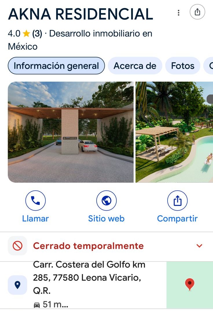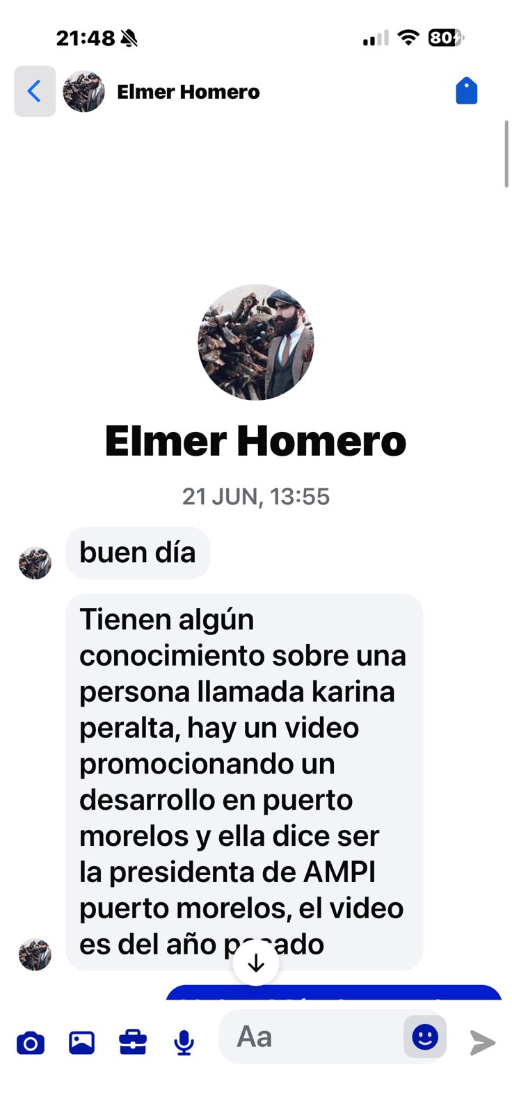Las investigaciones también alcanzan a la empresaria Karina Peralta, expresidenta de AMPI Puerto Morelos, quien aparece en diversos materiales promocionales como figura central de Akna Residencial, un desarrollo inmobiliario enclavado en Leona Vicario que hoy se encuentra cerrado temporalmente y señalado por compradores como un presunto fraude.