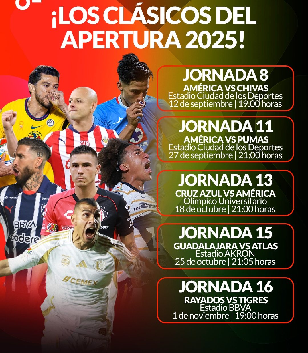 Asimismo, el Clásico Nacional entre América y Chivas se disputará el viernes 12 de septiembre en el Estadio Ciudad de los Deportes, correspondiente a la Jornada 8.