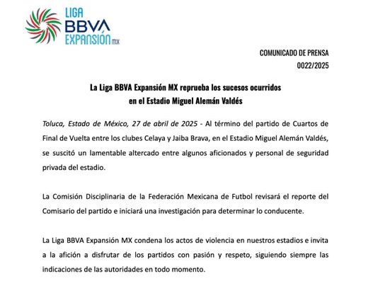 En el comunicado, la Liga de Expansión señala que ’’La Comisión Disciplinaria de la Federación Mexicana de Fútbol revisará el reporte del Comisario del partido e iniciará una investigación para determinar lo conducente”, en el texto también se condena cualquier acto de violencia y se invita a la afición a seguir las indicaciones del cuerpo de seguridad en todo momento.