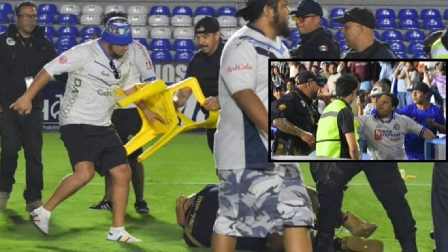 De acuerdo con videos que circulan en redes sociales, un elemento de seguridad apuntó con un artefacto hacia la tribuna, con lo que parecía ser un arma de fuego, lo que causó confusión entre los aficionados, hecho que culminó en la invasión de la cancha y la pérdida del control de las autoridades sobre el caos generado en la tribuna.