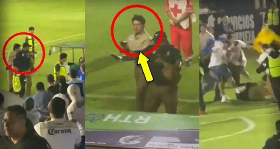 De acuerdo con videos que circulan en redes sociales, un elemento de seguridad apuntó con un artefacto hacia la tribuna, con lo que parecía ser un arma de fuego, lo que causó confusión entre los aficionados, hecho que culminó en la invasión de la cancha y la pérdida del control de las autoridades sobre el caos generado en la tribuna.