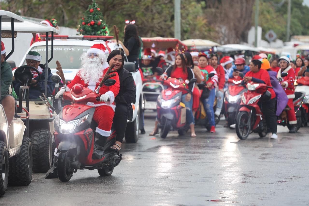 ISLA MUJERES, Q.ROO, 21 de diciembre-. En un ambiente de alegría, color y espíritu navideño, que no pudo estropear ni la lluvia que se dejó caer a ratos, la tradicional Caravana Navideña 2024 iluminó las calles de la isla con carros alegóricos y motocicletas decorados con luces y motivos alusivos a tan señaladas fechas.