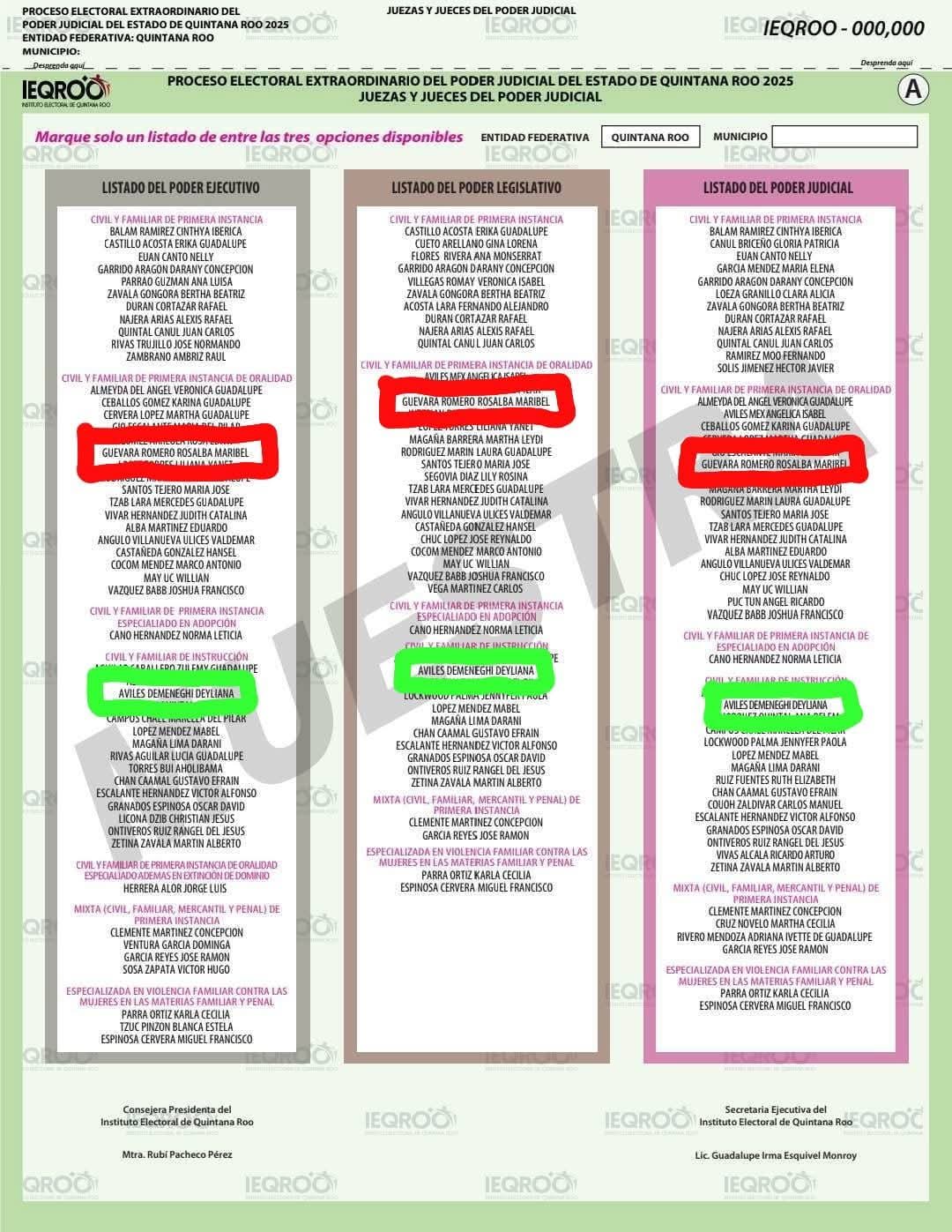 En este mismo sentido, hay que señalar que también la esposa del presidente del Teqroo, Rosalba Maribel Guevara Romero, es candidata a jueza civil y familiar de primera instancia de oralidad, igualmente repetida en las listas de los poderes Ejecutivo, Legislativo y Judicial.
