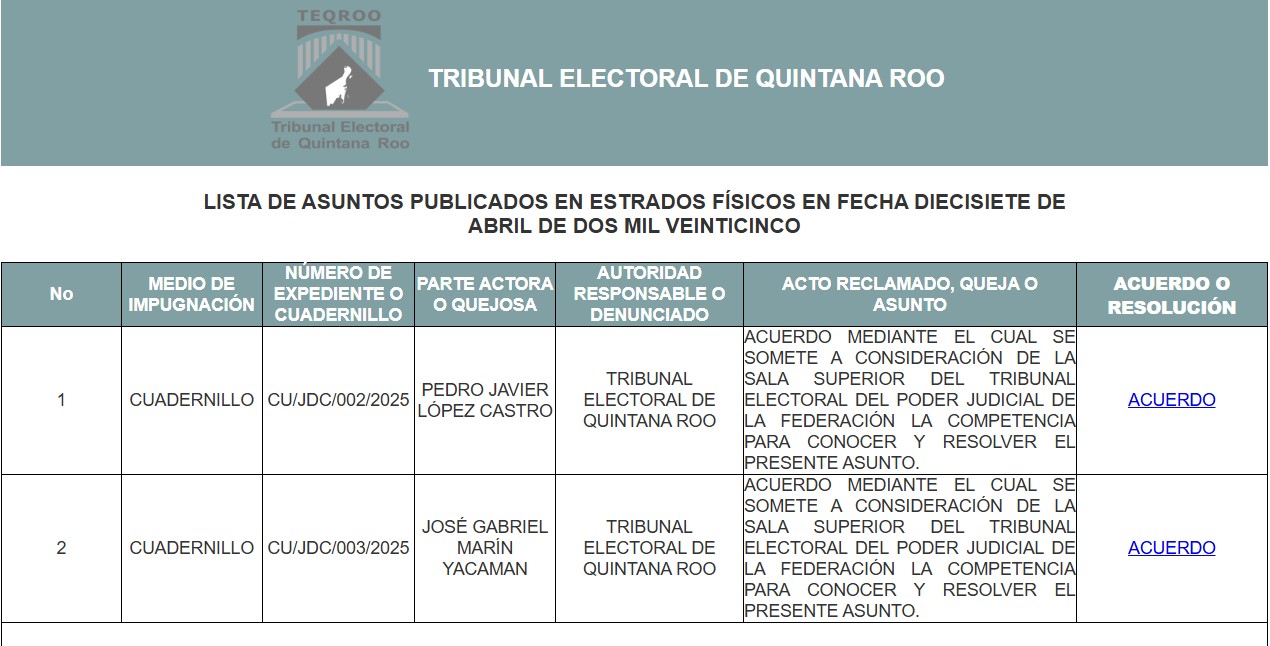 CHETUMAL, 18 de abril.- La Sala Regional Xalapa remitió a la Sala Superior del Tribunal Electoral del Poder Judicial de la Federación (TEPJF) las impugnaciones que presentaron tres candidatos jueces, en contra de las sentencias del Tribunal Electoral de Quintana Roo (Teqroo) que obligaron a modificar la manera como se presentan los nombres en las boletas electorales y el método de elección para que la ciudadanía elija a los jueces y magistrados en votación por listas completas y no por candidatos en lo individual.
