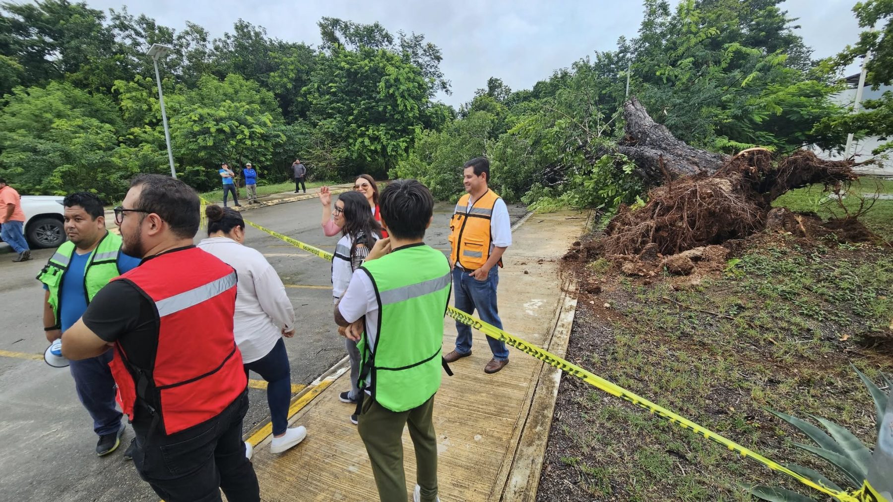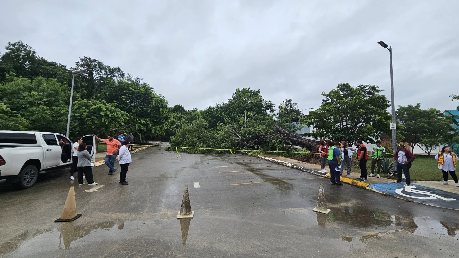 El ejemplar, aparentemente viejo y debilitado, cedió ante las ráfagas de viento y la saturación de humedad, cayendo directamente sobre el automóvil de una estudiante que en ese momento se encontraba dentro de su salón de clases. El estruendo alertó a personal y alumnos que salieron de inmediato a verificar lo ocurrido.