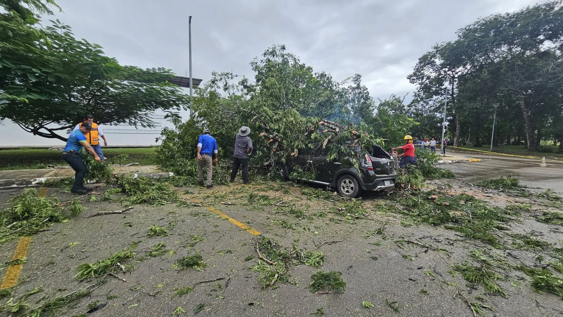 CHETUMAL, 13 de noviembre. – Las lluvias que cayeron esta tarde sobre la capital provocaron un incidente inesperado en la Universidad Tecnológica de Chetumal, donde un árbol terminó desplomándose sobre un vehículo estacionado en el área de alumnos.