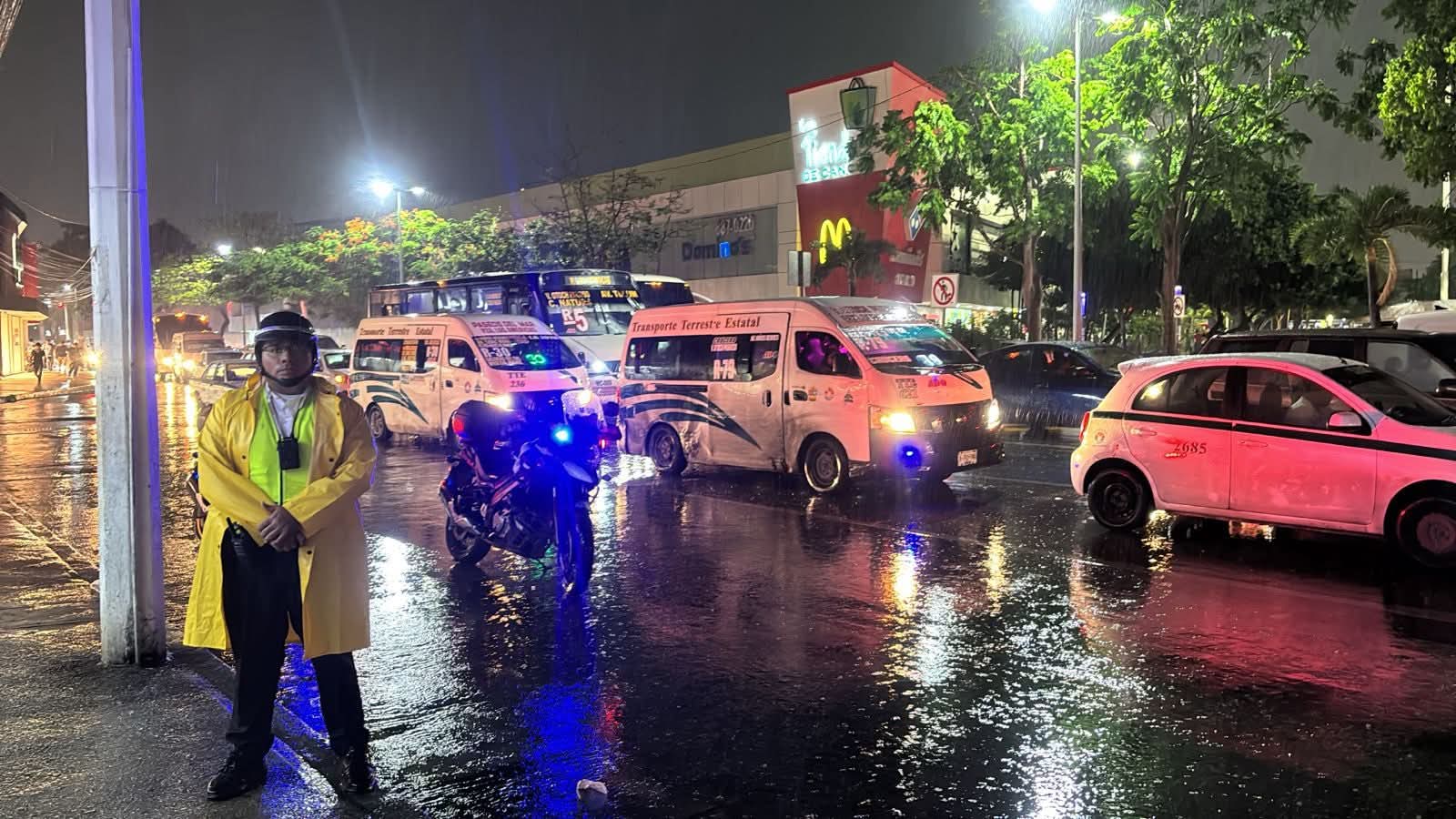 Cancún, 3 de octubre.- Ante las fuertes lluvias que afectan la ciudad, la Dirección de Tránsito de Cancún desplegó un operativo especial con 45 elementos en las principales arterias viales para garantizar la seguridad de los conductores y atender las afectaciones en la infraestructura urbana.