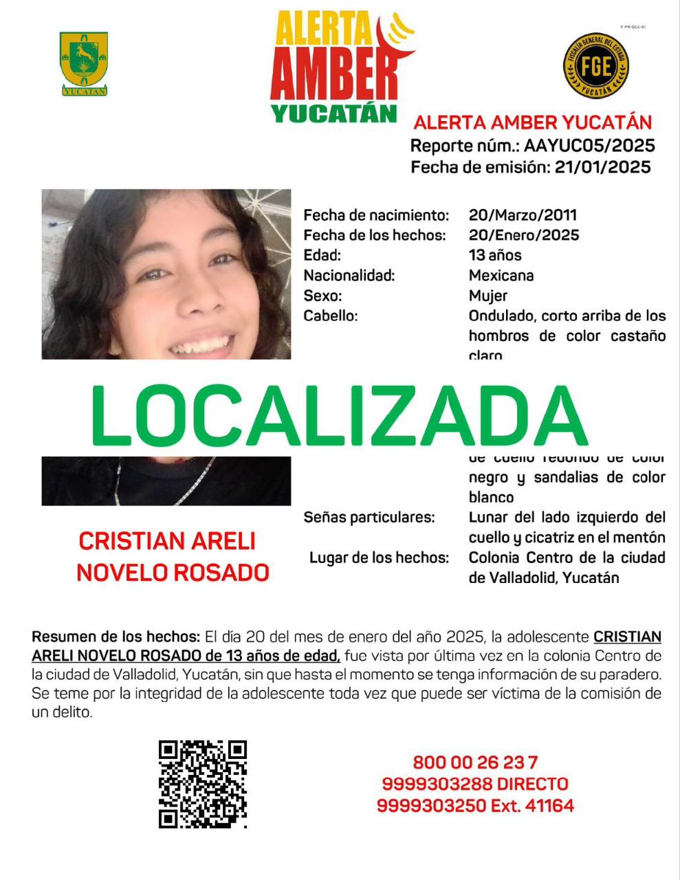 VALLADOLID, YUCATÁN, 22 DE ENERO DE 2025. Cristian Arely Novelo Rosado, una joven de 13 años reportada como desaparecida desde el pasado sábado, fue localizada por la Unidad de Investigación y Litigación de la Fiscalía General del Estado (FGE) en coordinación con la Policía Estatal de Investigación (PEI) y el Programa Alerta Amber Yucatán.