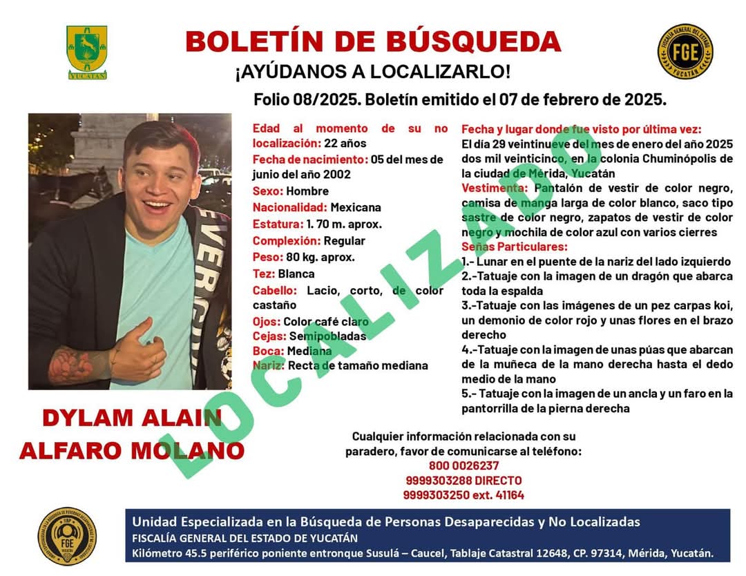 La tarde de este miércoles, las autoridades de Yucatán informaron que localizaron al joven Dylam, quien estuvo desaparecido durante 28 días, siendo que el pasado 29 de enero sus padres reportaron lo sucedido a través de redes sociales y posteriormente con las autoridades estatales, por lo cual, se emitió una ficha de búsqueda para su localización.