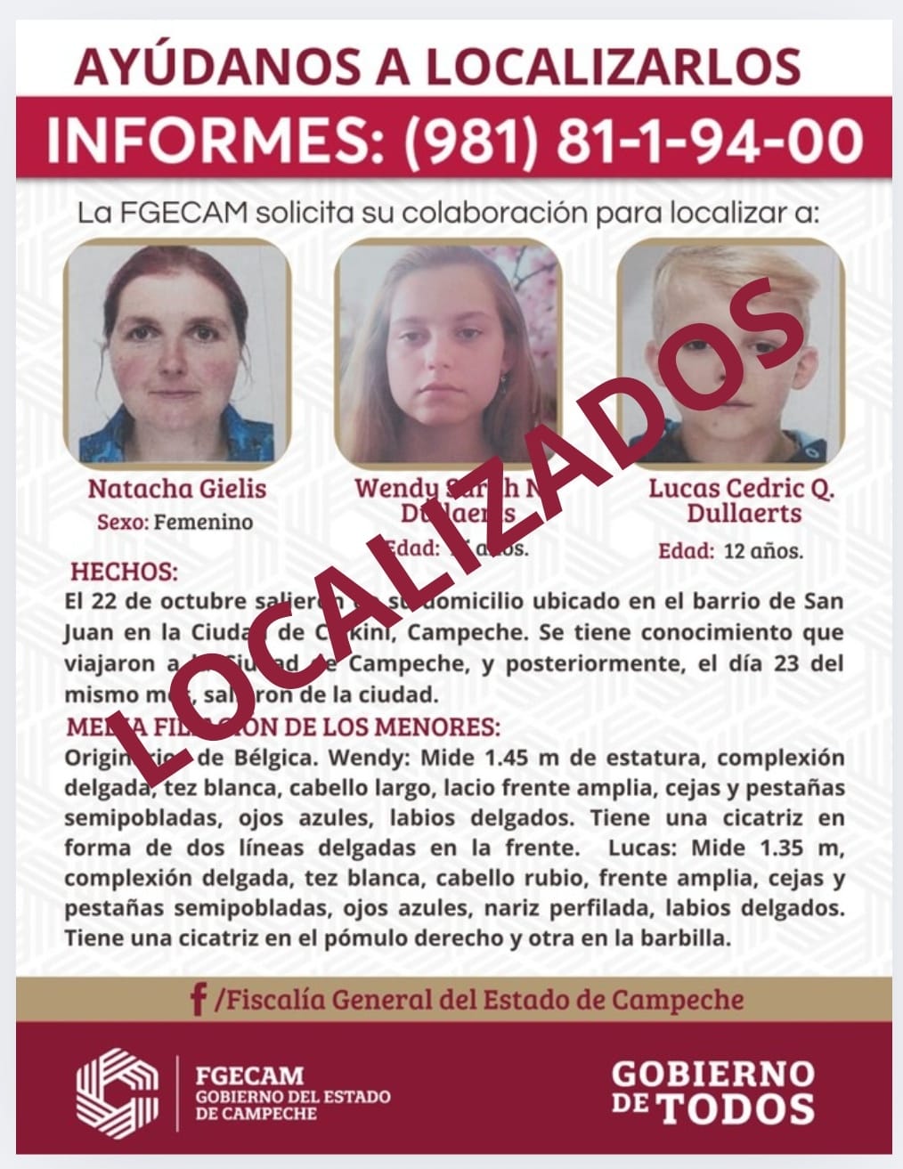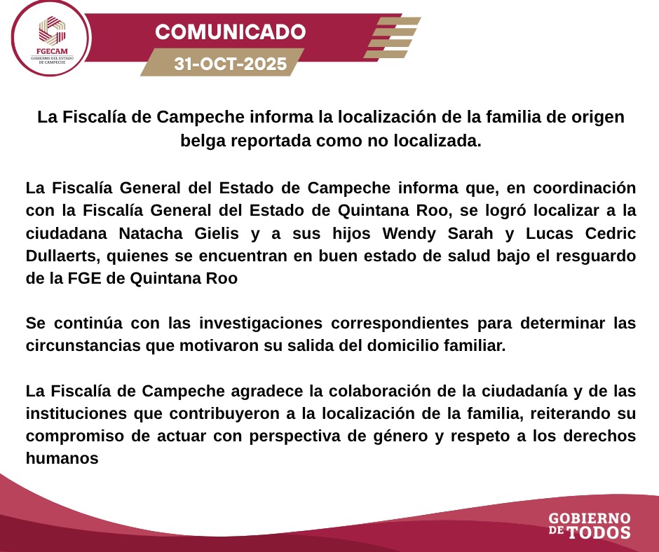 La Fiscalía General del Estado de Campeche informa que, en coordinación con la Fiscalía General del Estado de Quintana Roo, se logró localizar a la ciudadana Natacha Gielis y a sus hijos Wendy Sarah y Lucas Cedric Dullaerts, quienes se encuentran en buen estado de salud bajo el resguardo de la FGE de Quintana Roo.